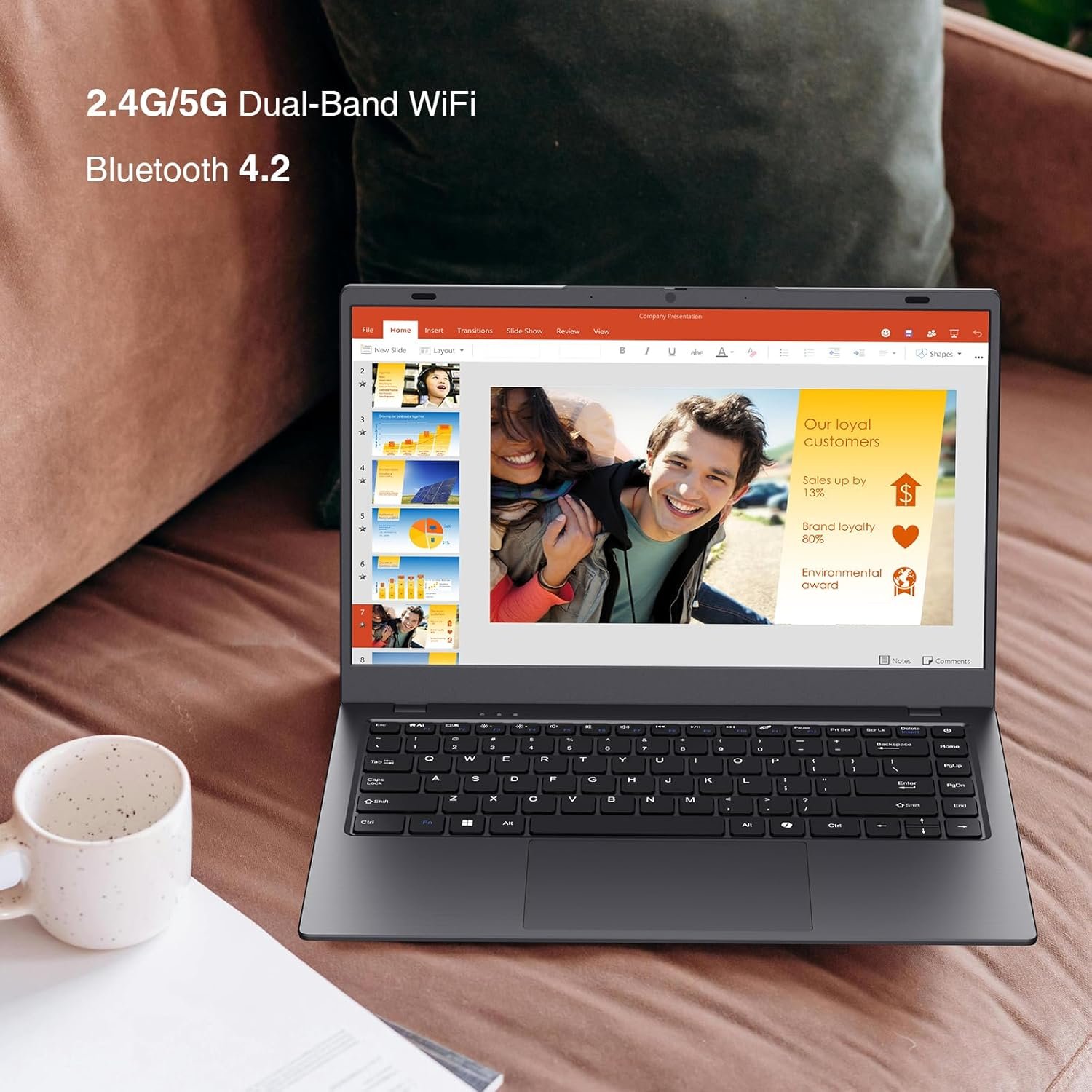 About this item Powerful Intel Celeron Processor: Fueled by a quad-core Intel Celeron processor, this laptop delivers efficient multitasking capabilities. With four threads and a base clock speed of 2.00 GHz, it boosts up to 2.9 GHz for demanding tasks, ensuring a smooth and responsive performance. Stunning 14″ HD IPS Display: Elevate your visual experience with the MARGOLAI laptop’s 14-inch 1366×768 IPS display. Enjoy crisp, clear visuals with vibrant colors and wide viewing angles, perfect for watching movies, editing photos, or tackling work projects. Ample Memory & Blazing-Fast Storage: Experience seamless multitasking with 8GB DDR4 RAM, providing ample memory for running multiple applications simultaneously. The 128 GB SSD ensures lightning-fast boot-up and data transfer speeds, giving you instant access to your files and programs. Enhanced Connectivity & Privacy Features: Stay connected with 2.4G/5G dual-band WiFi for faster, more reliable internet access. Bluetooth 4.2 enables seamless pairing with wireless devices. Plus, a sliding camera shutter offers added privacy and peace of mind, ensuring you’re always in control of your visual privacy. Versatile Port Selection for All Your Devices: The MARGOLAI laptop boasts a comprehensive set of ports, including USB-A 3.2 and USB-A 2.0 for connecting peripherals, Micro SD for expandable storage, HDMI for screen sharing, a headphone jack for private listening, and a DC interface for charging. Perfect for connecting to all your devices and accessories.