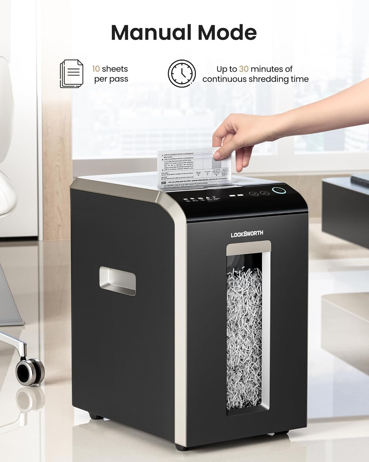 In manual mode, the micro-cut shredder will run continuously for 30 minutes, shredding up to 10 standard sheets at a time