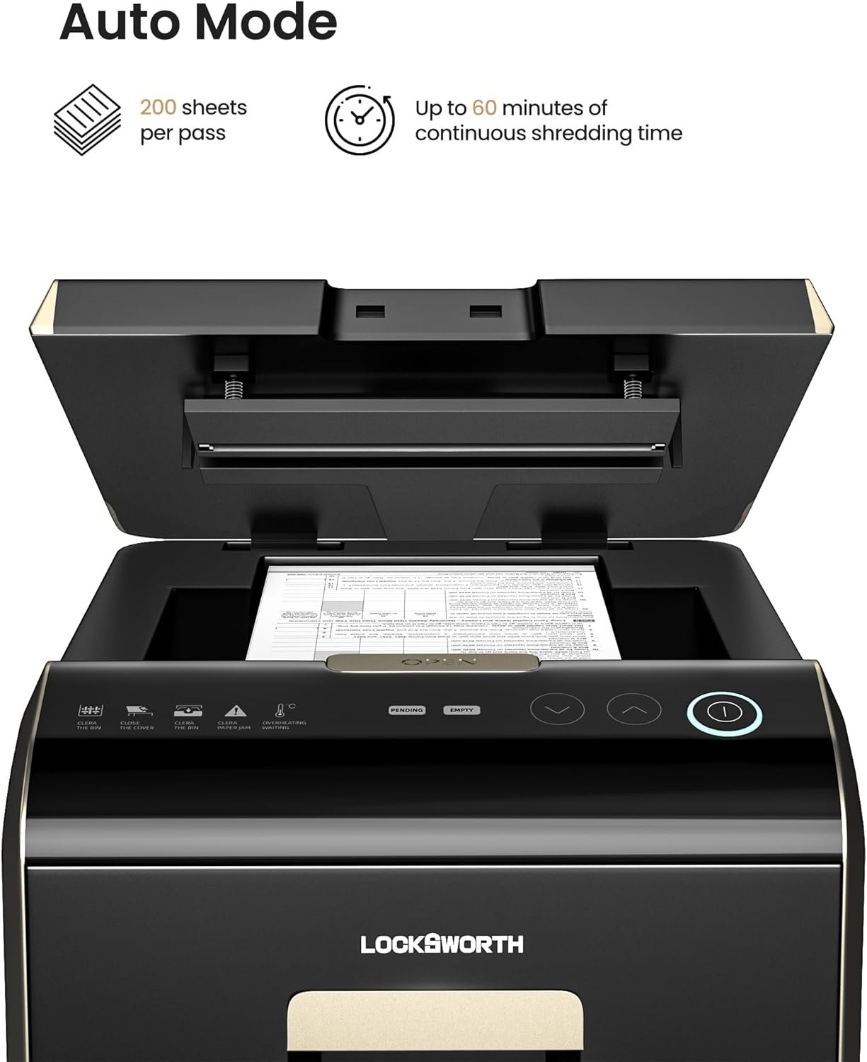 The 200-sheet micro-cut shredder runs continuously for 60 minutes(auto mode)