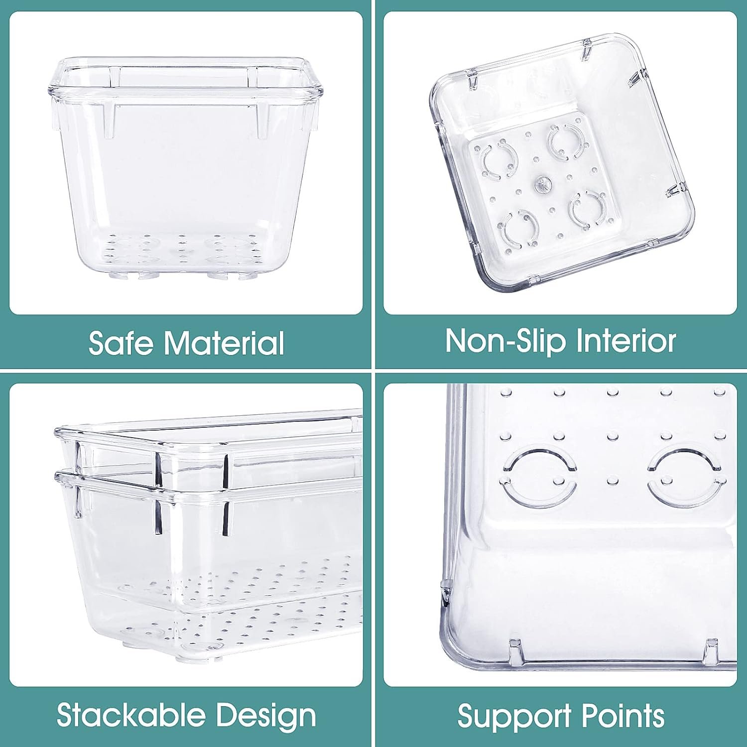 About this item Premium Material:The drawer organizer is made of plastic which may be safely used. The transparent design makes it easy to find what you need quickly. 4 Combinations of Different Sizes: A set of cabinet organizer includes 25 storage bins of 4 different sizes. Includes: 9 x 6 x 1.8 inches (3pcs), 9 x 3x 1.8 inches(6pcs), 6 x 3 x 1.8 inches(8pcs), 3 x 3 x1.8 inches(8cps). Long lasting and Non-Slip: The plastic has 3-5 times the impact strength of other materials and is robust and Long lasting. The bottom of the storage organizers has a non-slip design to prevent the tray from moving around when the drawer is opened and closed. Stackable Design: These clear storage bins stack into one other to help maximize your space. Use them side by side to keep organized. The clear color allows you to save time and find what you need quickly and easily. Variety Storage Ways: These versatile Drawer Divider trays fit any part of your home. Suitable for all kinds of drawers, such as dresser / bathroom / kitchen / office. Ideal choice for organizing cosmetics, pins, hair accessories, jewelry, office supplies, craft supplies, utensils, etc.