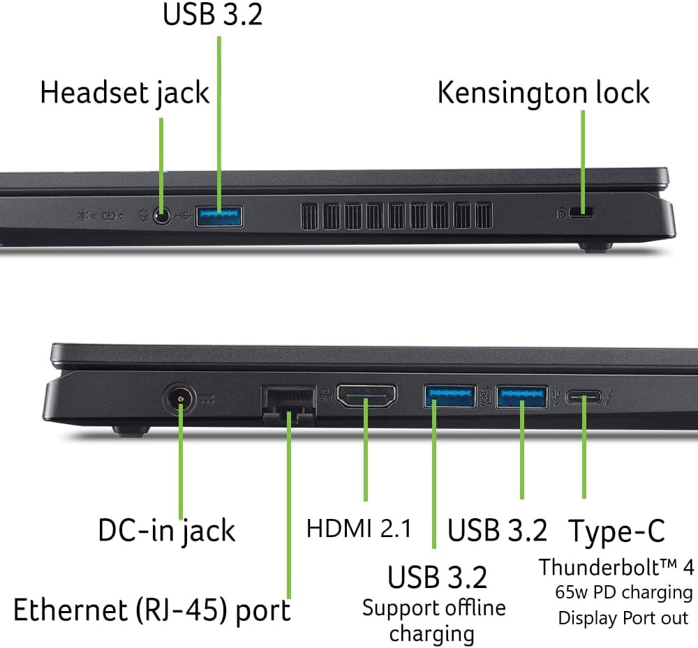 Always Be Heard and Seen: Experience crystal clear communication with AI-powered Acer PurifiedView and PurifiedVoice noise reduction technology. You’ll feel like you’re in the command center of a spaceship, with pinpoint sound accuracy giving you the edge in your gaming skirmishes. Ports For All Your Accessories: 1 – USB Type-C Port USB 3.2 Gen 2 (up to 10 Gbps) DisplayPort over USB Type-C, Thunderbolt 4 and USB Charging, 1 – USB 3.2 Gen 1 Port (Featuring Power-off Charging), 2 – USB 3.2 Gen 1 ports, 1 – HDMI 2.1 Port with HDCP support, 1 – Headphone/Speaker/Line-out Jack, 1 – Ethernet (RJ-45), DC-in for AC adapter, 1 – Kensington Lock Slot The Right Fit: 14.26″ W x 9.44″ D x 0.93/1.06″ H; 4.66 lbs.; One-Year International Travelers Limited Warranty (ITW) Show more › See more product details