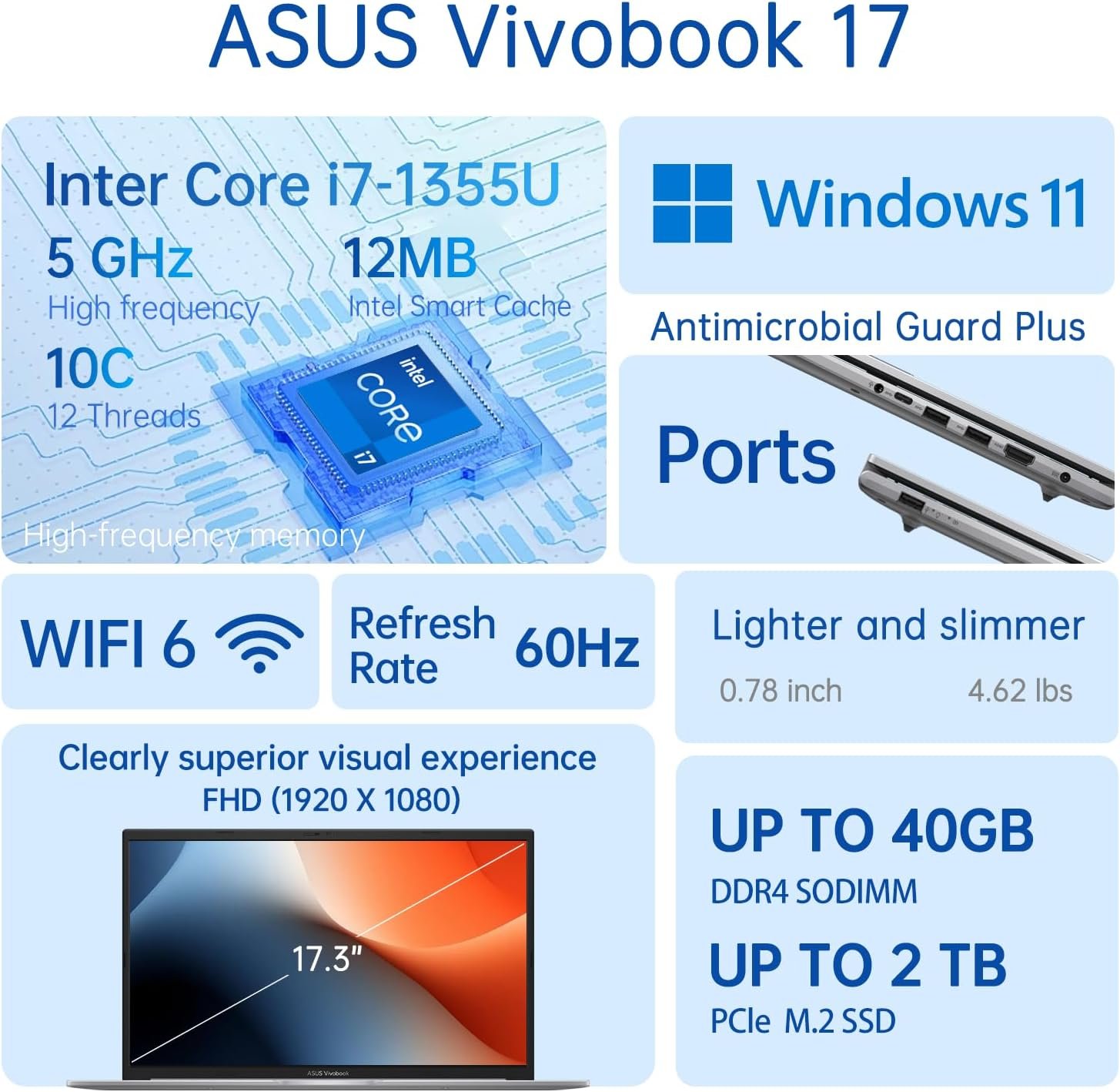 ASUS Vivobook Premium 17.3 F1704 AI Business Laptop, 17.3 FHD, Intel i7-1355U, 24GB RAM, 1TB SSD, Backlit Numeric KB, Privacy Camera, Bundle with PCO Notebook Folding Radiator, Laptop Cooler