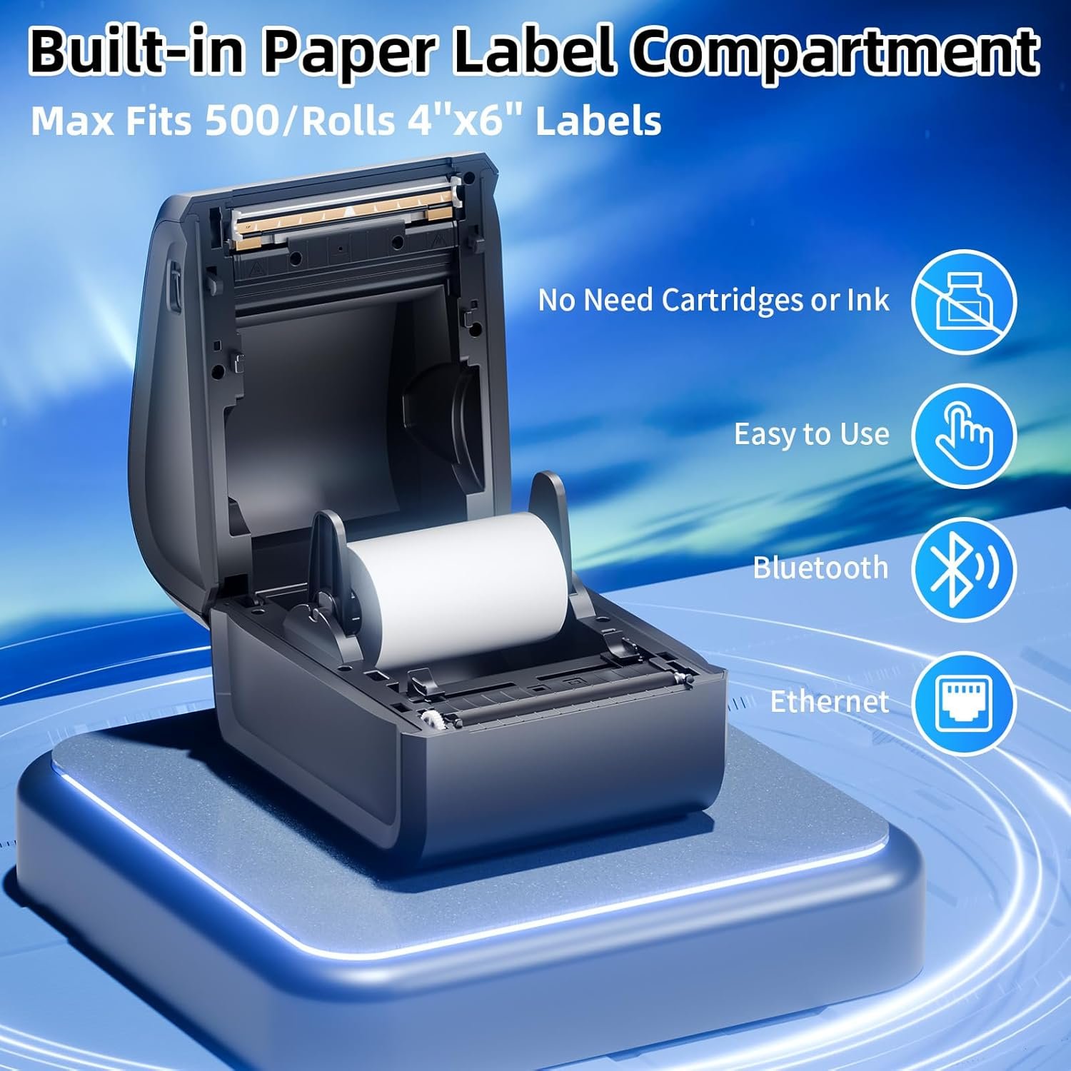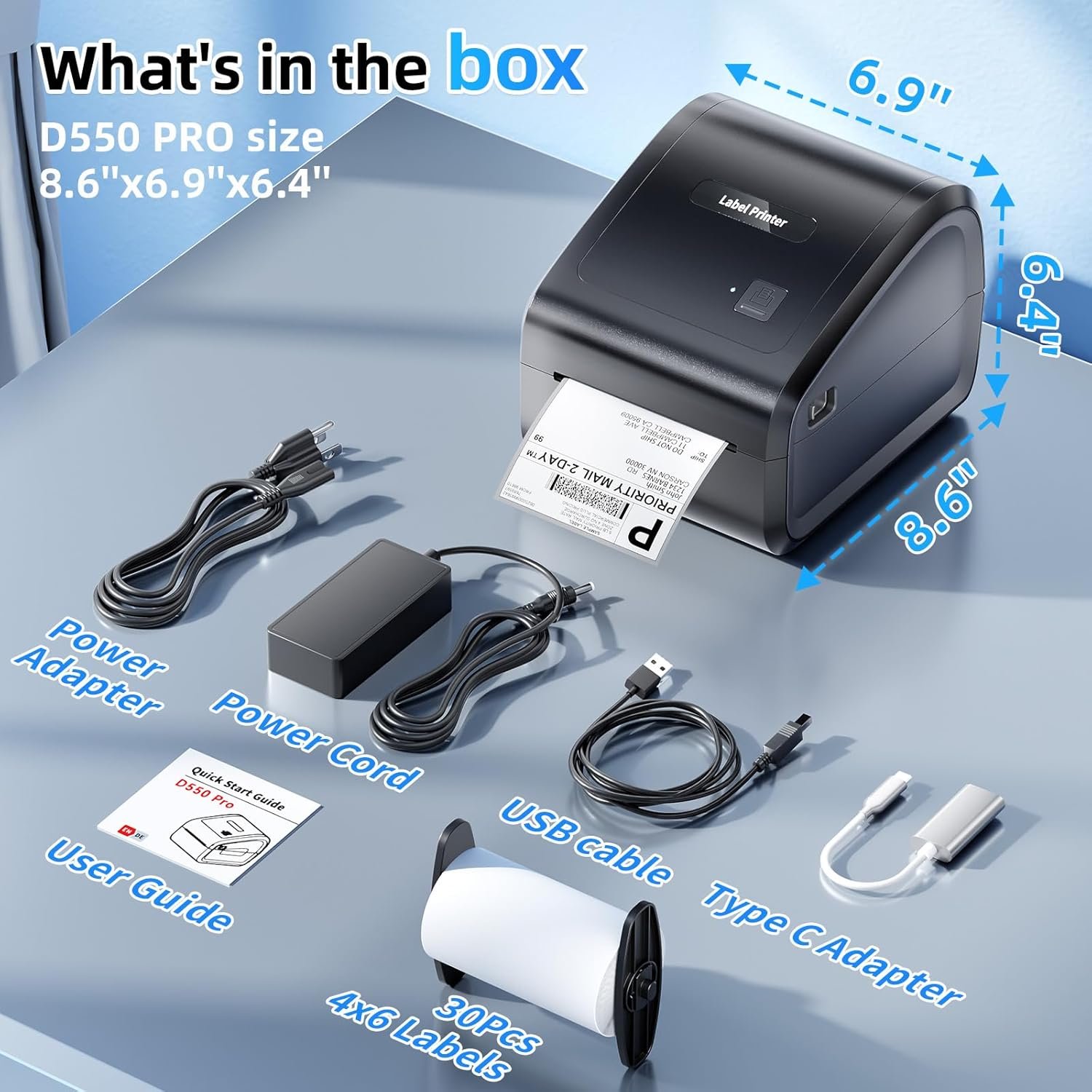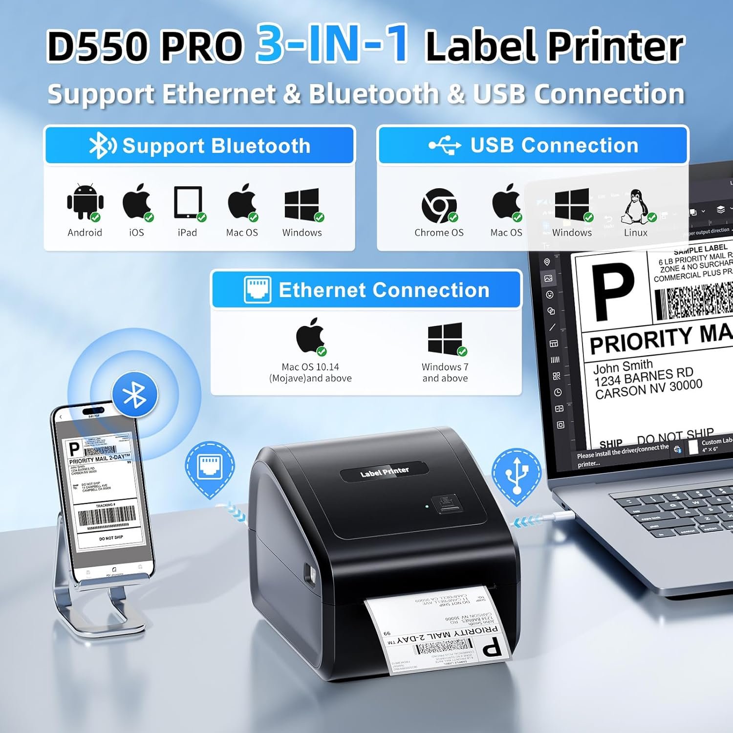 About this item [3-IN-1 Ethernet Label Printer] – We made it! In addition to Bluetooth and USB, D550 Pro shipping label printer also supports Ethernet connection printing, can print labels anytime, anywhere from Win/MacOS computer on the same LAN! Besides, Ethernet printing ensures stable file transfers, no more worrying about print drops. Undoubtedly, Our thermal label printer can help your business grow faster and work more efficiently [Print Labels Wireless with Bluetooth] – The D550 Pro shipping label printer offers seamless Bluetooth connectivity with Android/iOS and Windows/macOS/Linux/ChromeOS systems. Print labels on-the-go without location constraints. If you prefer a USB connection, the label printer 4×6 can also be connected to USB and is compatible with all major computer systems. Note: All Bluetooth should be connected via the App in the guide [Compact Thermal Printer] – The D550 Pro label printer 4×6’s innovative design allows for both roll and folded paper loading, reducing the need for additional holders. Besides, thermal shipping label printer’s compact 8.6 x 6.9 x 6.4 inches footprint saves much more space, making it twice as efficient as other mailing printers. This thermal label printer 4×6 is a space-saving solution that simplifies and enhances your workflow [Strong Helper for Different Use] – Thanks to the upgraded thermal technology, the bluetooth label printer delivers superior 203DPI resolution and an impressive output of 72 labels per minute. Besides, this versatile wireless label printer accommodates label widths between 1 and 4.6 inches, making this desktop label printers perfect for producing shipping, mailing, barcode, and various other types of labels you require [Wide Platform Compatibility] – The D550 Pro usps label printer works seamlessly with major shipping and sales platforms like USPS, UPS, FedEx, Amazon, eBay, Shopify, Etsy, PayPal, and Poshmark. Perfect for small online businesses, barcode label printer simplifies shipping and boosts efficiency. Start your small business with this reliable mailing label printer