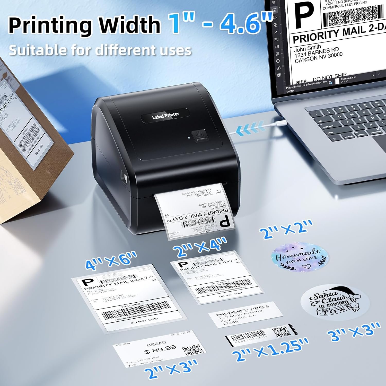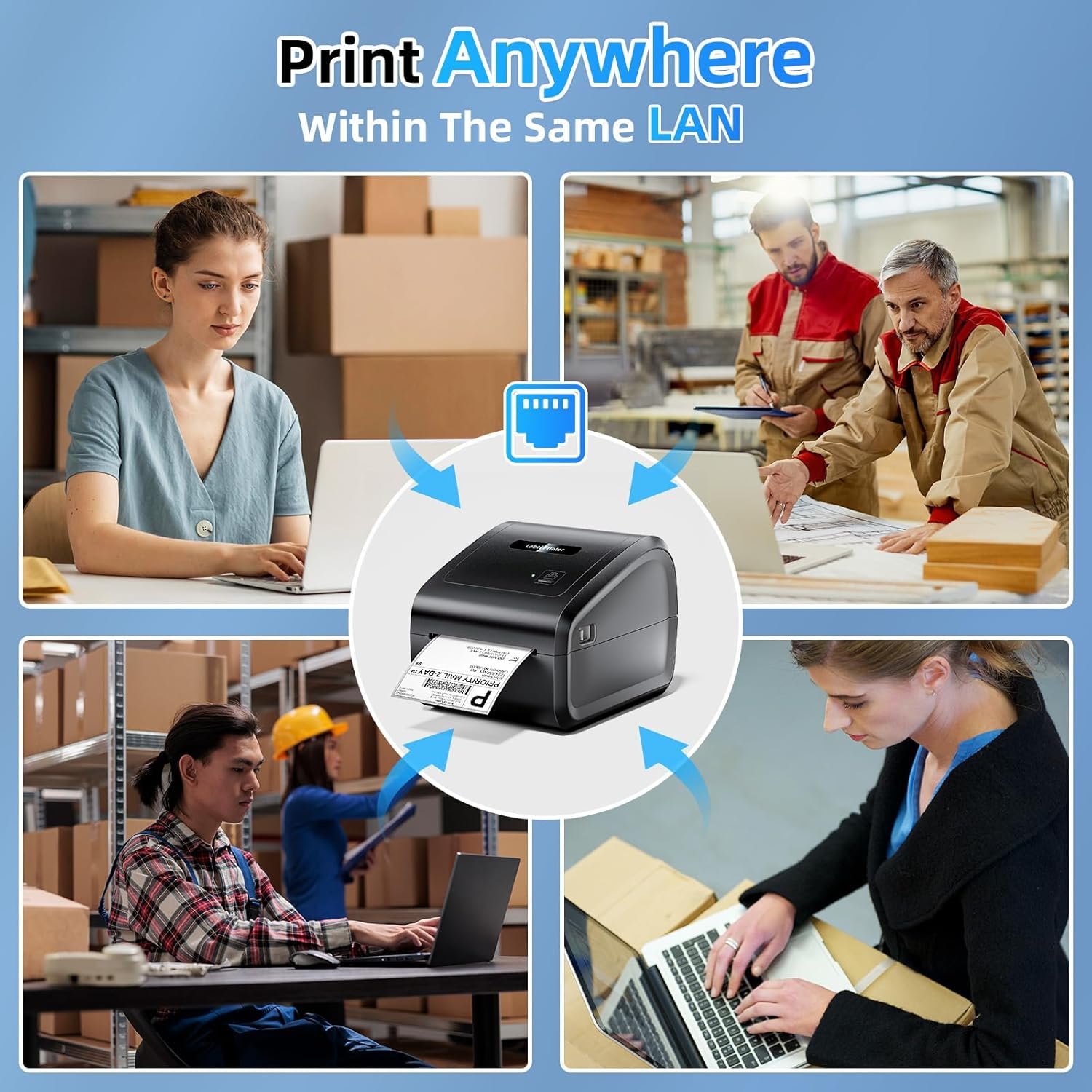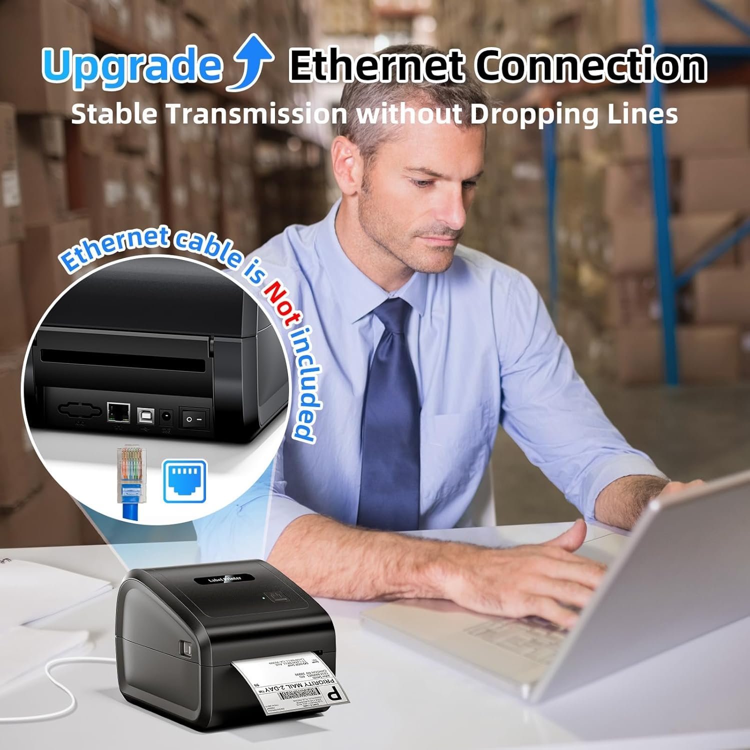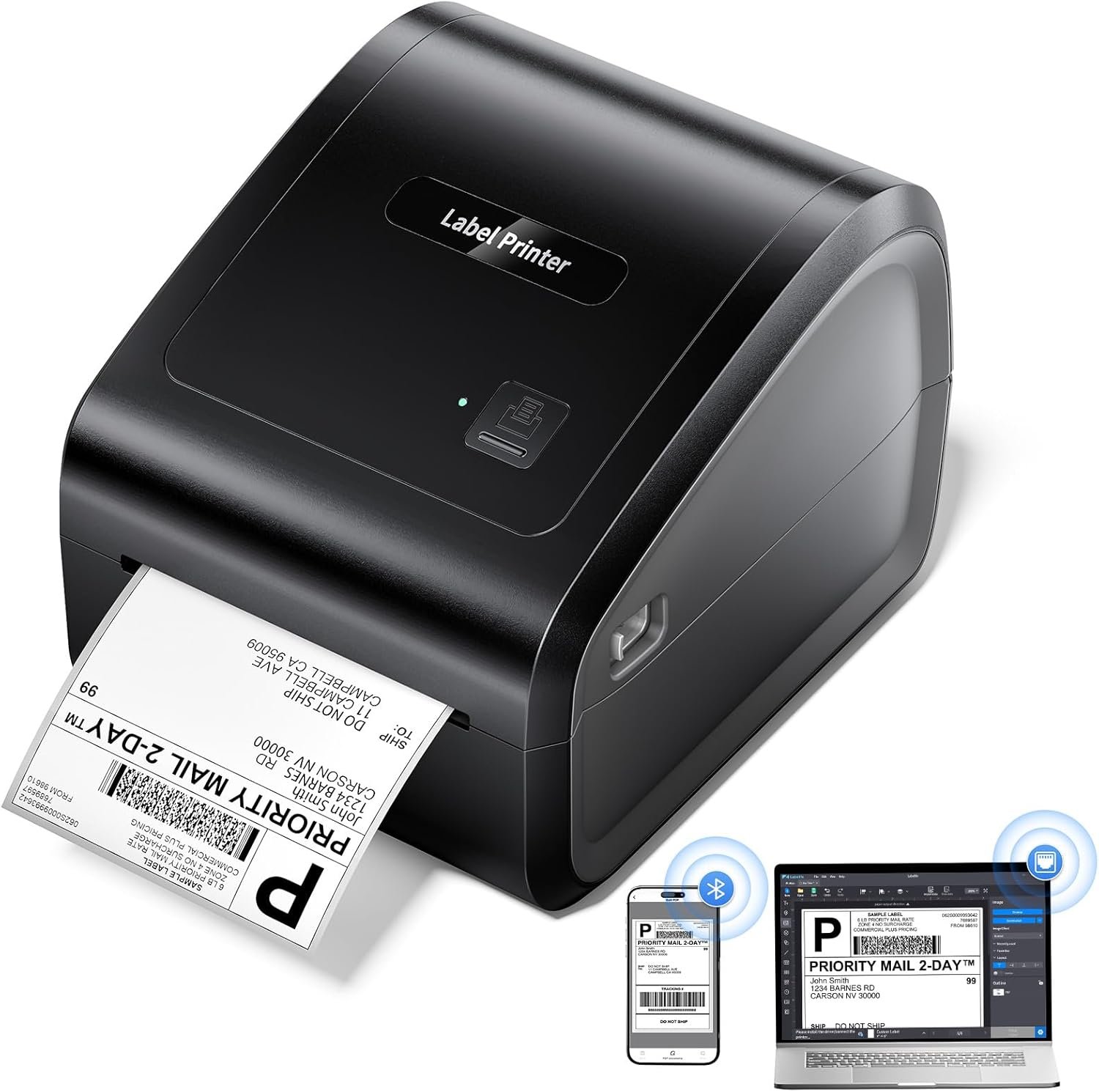 About this item [3-IN-1 Ethernet Label Printer] – We made it! In addition to Bluetooth and USB, D550 Pro shipping label printer also supports Ethernet connection printing, can print labels anytime, anywhere from Win/MacOS computer on the same LAN! Besides, Ethernet printing ensures stable file transfers, no more worrying about print drops. Undoubtedly, Our thermal label printer can help your business grow faster and work more efficiently [Print Labels Wireless with Bluetooth] – The D550 Pro shipping label printer offers seamless Bluetooth connectivity with Android/iOS and Windows/macOS/Linux/ChromeOS systems. Print labels on-the-go without location constraints. If you prefer a USB connection, the label printer 4×6 can also be connected to USB and is compatible with all major computer systems. Note: All Bluetooth should be connected via the App in the guide [Compact Thermal Printer] – The D550 Pro label printer 4×6’s innovative design allows for both roll and folded paper loading, reducing the need for additional holders. Besides, thermal shipping label printer’s compact 8.6 x 6.9 x 6.4 inches footprint saves much more space, making it twice as efficient as other mailing printers. This thermal label printer 4×6 is a space-saving solution that simplifies and enhances your workflow [Strong Helper for Different Use] – Thanks to the upgraded thermal technology, the bluetooth label printer delivers superior 203DPI resolution and an impressive output of 72 labels per minute. Besides, this versatile wireless label printer accommodates label widths between 1 and 4.6 inches, making this desktop label printers perfect for producing shipping, mailing, barcode, and various other types of labels you require [Wide Platform Compatibility] – The D550 Pro usps label printer works seamlessly with major shipping and sales platforms like USPS, UPS, FedEx, Amazon, eBay, Shopify, Etsy, PayPal, and Poshmark. Perfect for small online businesses, barcode label printer simplifies shipping and boosts efficiency. Start your small business with this reliable mailing label printer