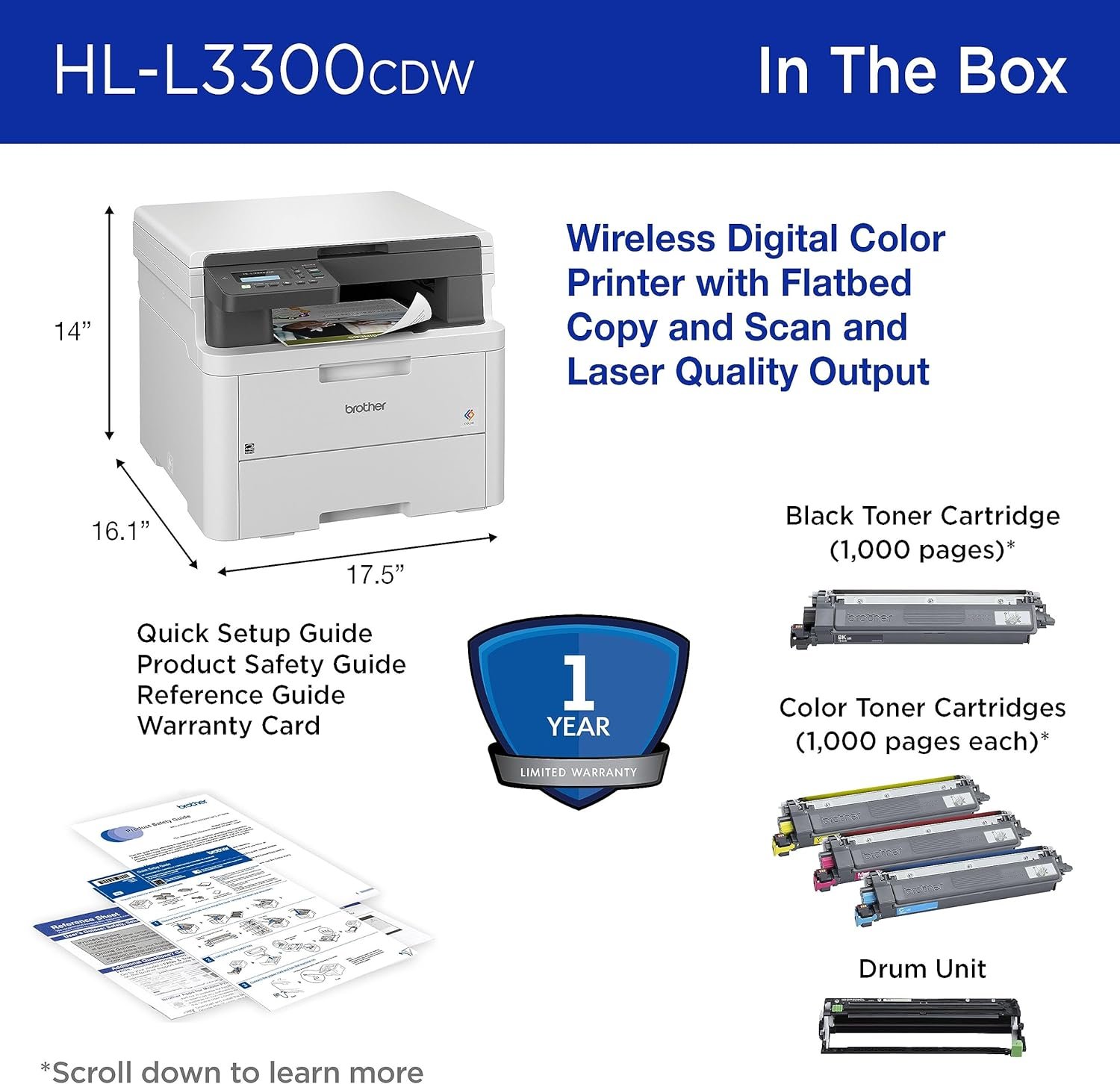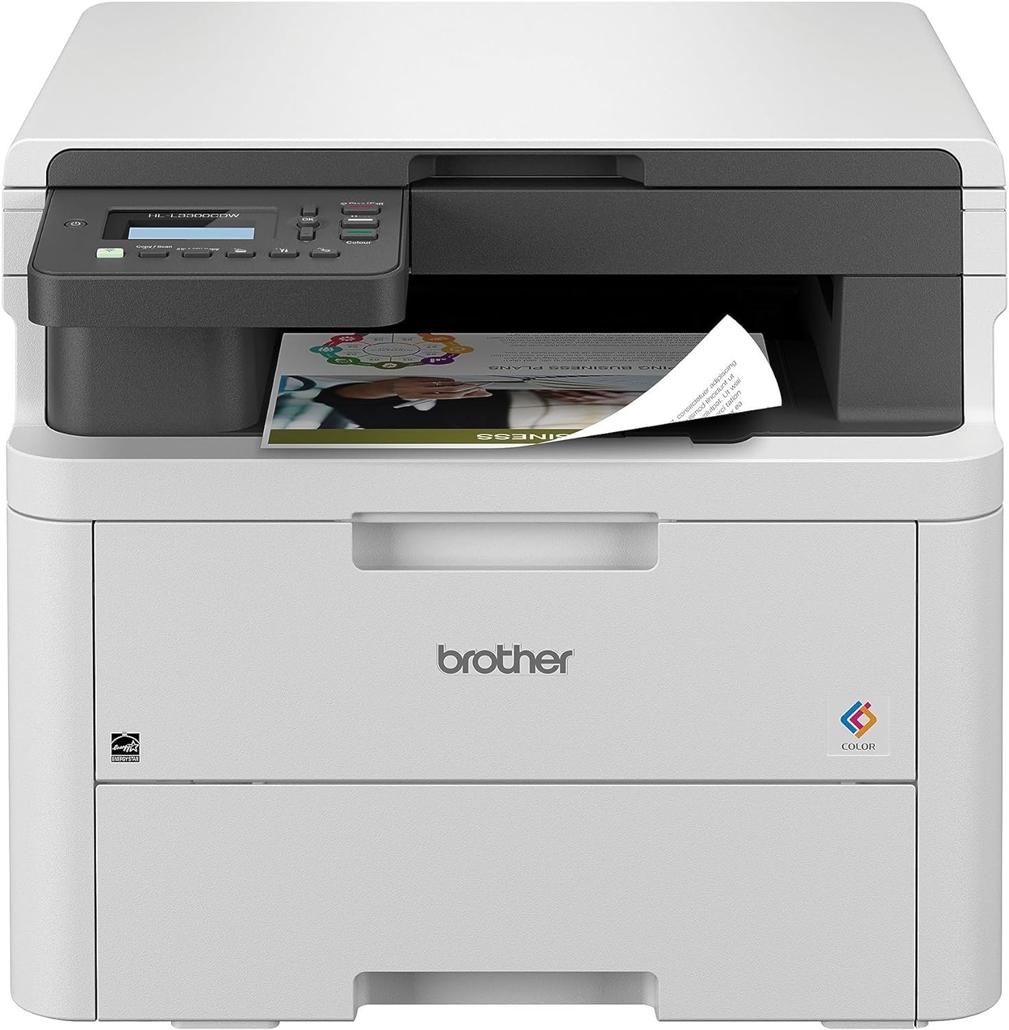 About this item Best for Small Offices and Work from Home, the Brother HL-L3300CDW wireless compact 3-in-1 digital color printer with copy & scan functionalities consistently produces affordable, laser-quality output on every page. UPGRADE YOUR PROFESSIONAL DOCUMENTS. With the consistent dependability of laser-quality digital color printing. EFFECTIVE PRODUCTIVITY WITH THREE-IN-ONE FUNCTIONALITY. Featuring a flatbed scan glass for convenient copying and scanning capabilities from a single, compact machine. Quickly creates documents with print speeds of up to 19 pages per minute (ppm)(1). FLEXIBLE CONNECTION OPTIONS. Count on steady connections at the office or on the go. Built-in dual band wireless (2.4GHz / 5GHz)(4), and Wi-Fi Direct, or USB interface for local connection to a single computer.