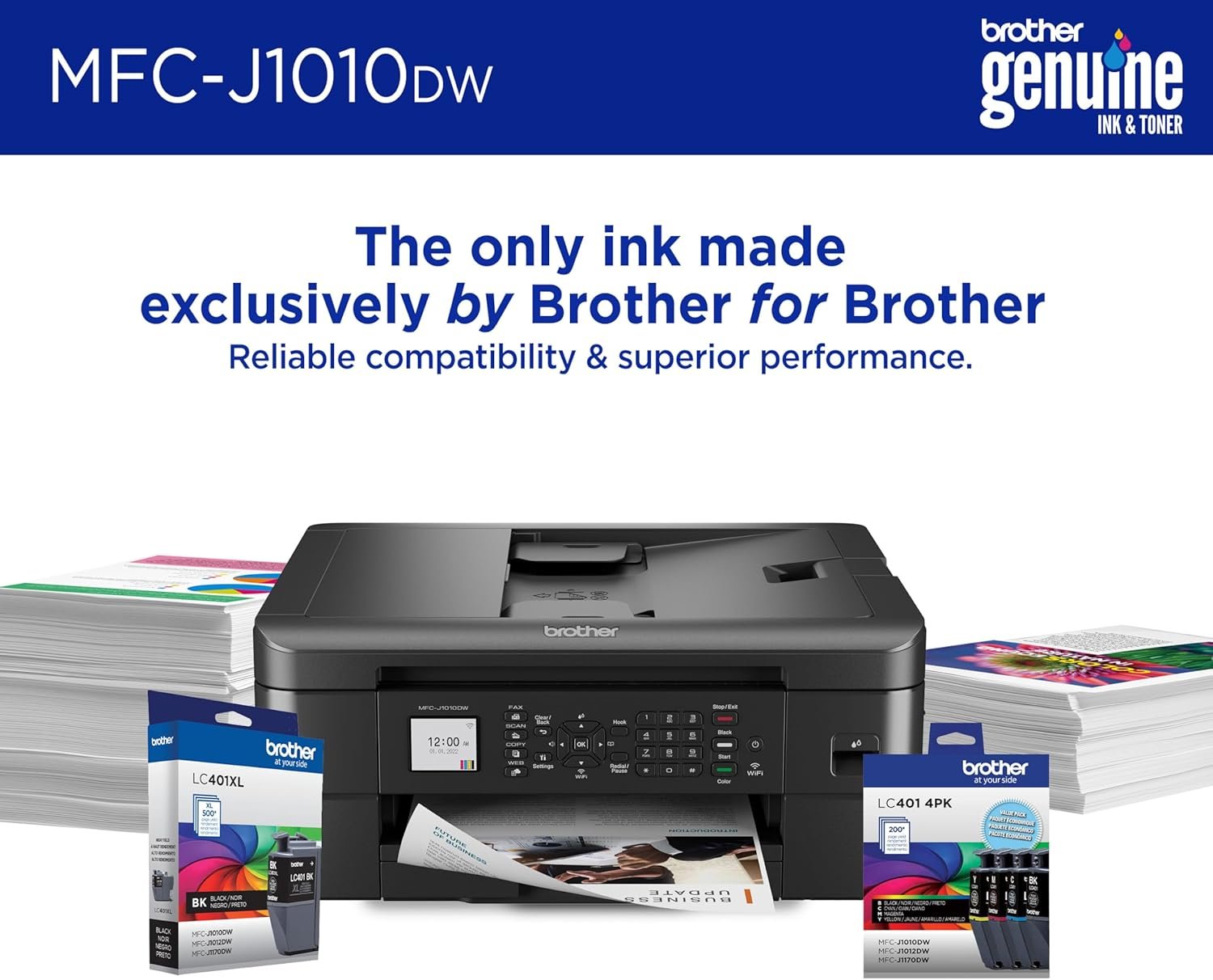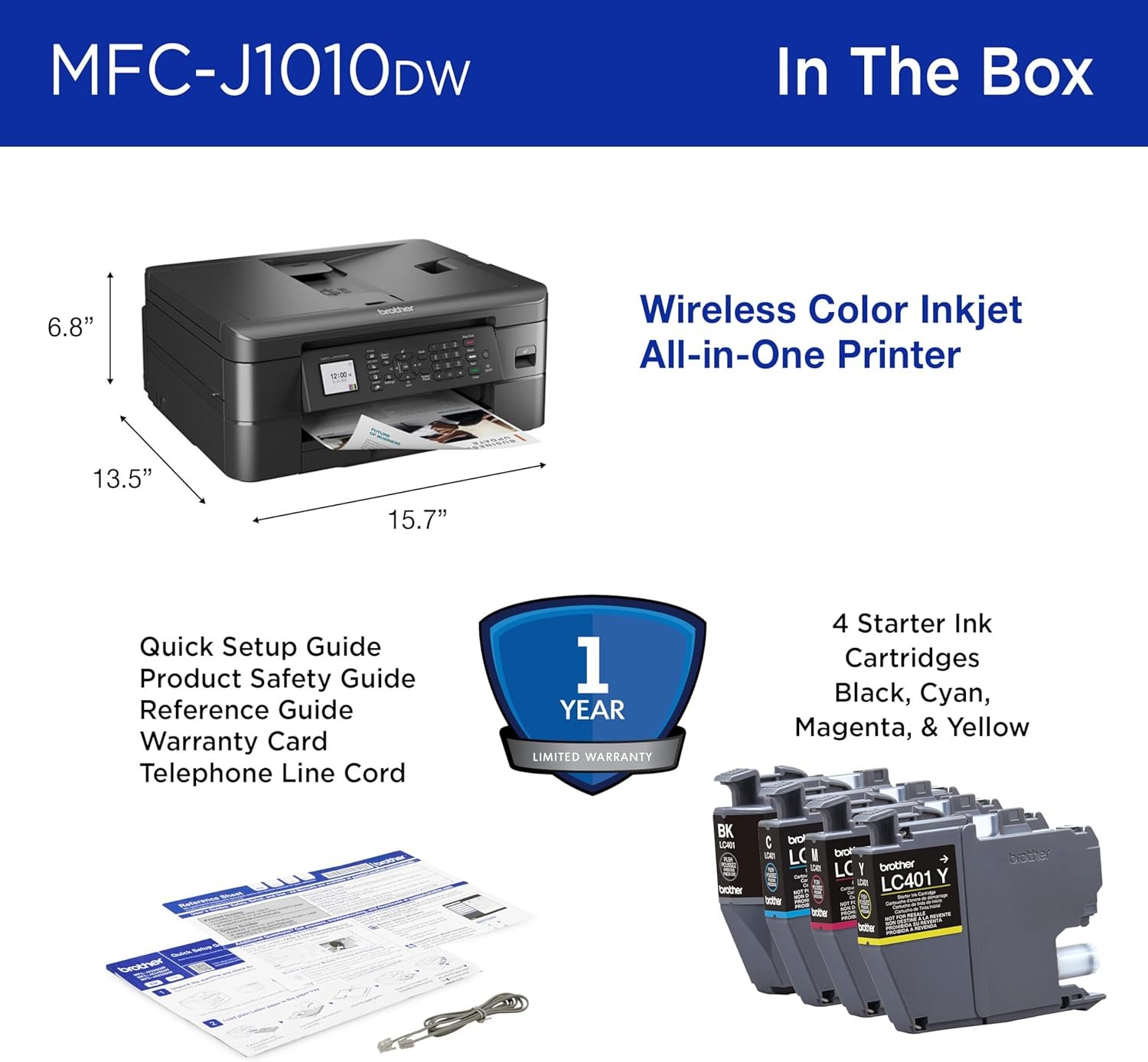 About this item The Brother MFC-J1010DW is compact and economical, perfect for small spaces and budgets DELIVERING FULL FUNCTIONALITY IN A SMALL SPACE. There’s no sacrificing features with this welcome addition to any home, home office or small office space. This compact inkjet all-in-one delivers full functionality plus fast print and scan speeds PUT THE POWER OF PRINTING AT YOUR FINGERTIPS: The simple to use Brother Mobile Connect(1) App delivers easy onscreen menu navigation for printing, copying, scanning and printer management from your mobile device VERSTAILE PAPER HANDLING AND DUPLEX PRINTING. Use the 20-page capacity automatic document feeder for quick copying and scanning to handle a variety of media. The 150-sheet capacity adjustable paper tray minimizes paper refills
