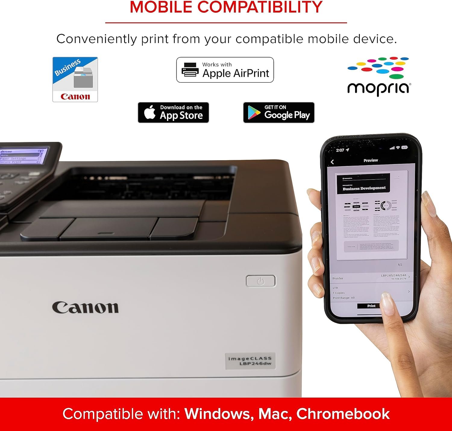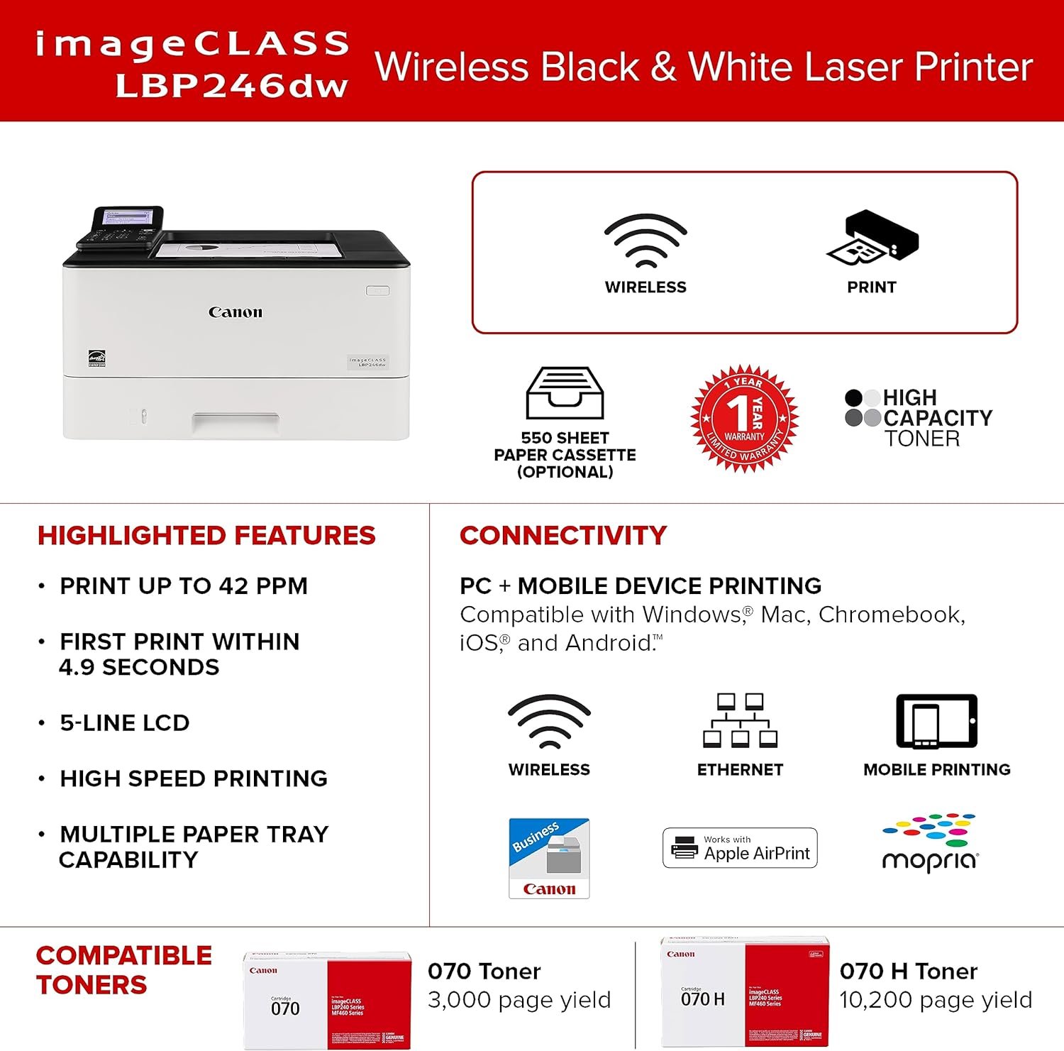 About this item FAST PRINT SPEEDS: Print up to 42 pages per minute and spend less time waiting with a quick first print time of approximately 5 seconds. 5 LINE LCD: Monochrome screen for easy navigation. MOBILE DEVICE PRINTING: Print from your compatible mobile devices using the free Canon PRINT Business app, Apple AirPrint and Mopria Print Service. EASY WIRELESS SETUP: Setup your wireless connection and get up and running in just a few steps. AUTO 2-SIDED PRINTING: Save paper and limit paper replacements with automatic 2-sided printing. GENEROUS, EXPANDABLE PAPER CAPACITY, UP TO 900 SHEETS: Load 250 sheets in the standard cassette, 100 sheets in the multipurpose tray and 550 sheets in optional paper cassette AH-1. HIGH-CAPACITY GENUINE TONER: Get high-quality output you can be proud of and high page yields that keep up with your printing needs and help limit toner replacements.