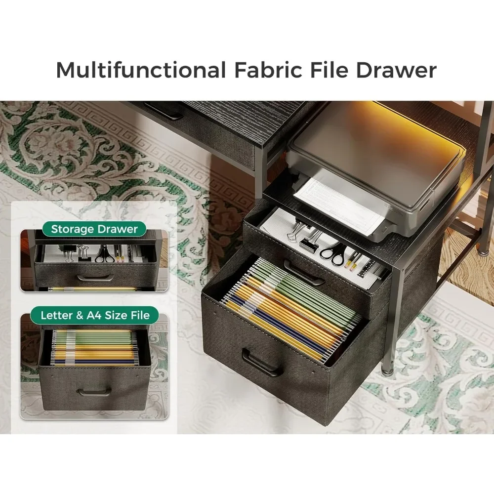 • 【Sturdy Construction & Multi-function Desk】study desk is constructed by premium metal frame & high-quality MDF Board to ensure stability and durability as well as scratch and water resistance. This computer desk is equipped with a file cabinet, three fabric drawers, a power strip, a LED strip, a monitor stand and a printer stand, providing large storage space and convenient functions, perfect for working or gaming at home.