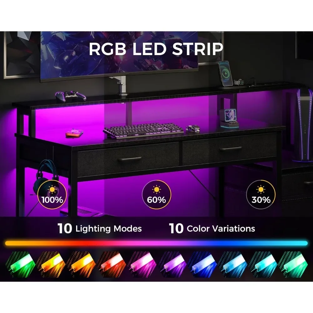 Computer Desk with 4 Drawers,48 Inch Reversible Desk with Led Lights & Power Outlet,Office Desk with File Drawer & Monitor Stand