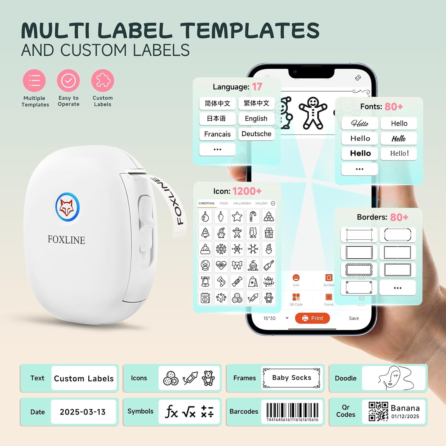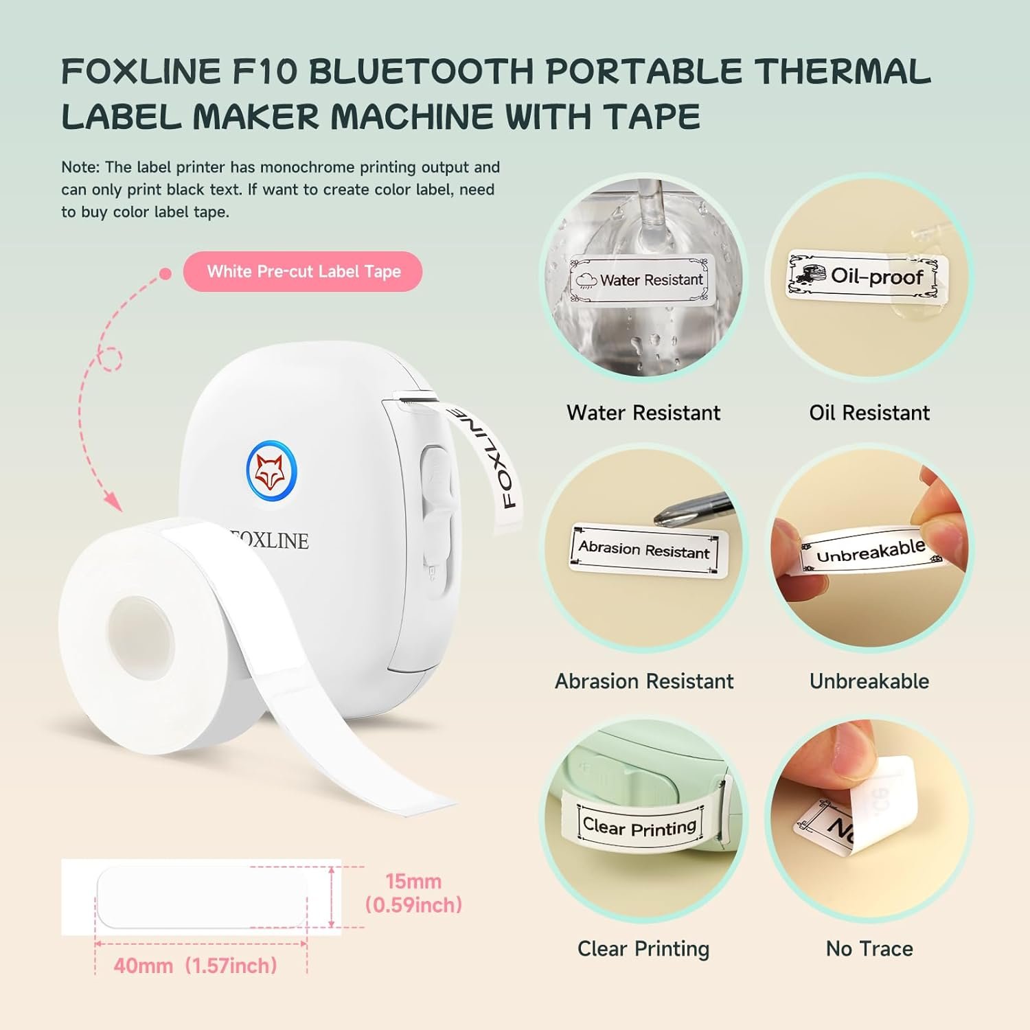 About this item More Intelligent and Convenient: Compared with traditional label printers, smaller (size: 2.96 * 3.91 * 1.76 inches), smarter, wireless bluetooth mini thermal label printer can slip into pocket for easy carrying and printing anytime, anywhere. Without requiring ink or toner, saving you money and time. Wireless bluetooth connection is fast and stable. FOXLINE F10 label maker machine with tape comes with built-in 1200mAh rechargeable battery that can work for a long time. (Adapter is not included) Wide Application: The bluetooth label maker is ideal for home organization, price tags, food date tags, cosmetics classification, can labels, kindergarten name labels, personal item recognition, school and office document classification, storage, etc. Provides various templates, including text, icons, frames, doodle, date, symbols, barcodes, QR codes, etc. More convenient and efficient printing, making your life more organized and efficient. Easy to Use: You can download the “SharpFox” app from Google Play or App Store, and then easily connect your phone through the app and Bluetooth pairing to edit and print your own personalized custom labels. The sticker maker supports iOS and Android phones. (Note: The sticker printer is not suitable for computers or tablets) The label machine has a hanging rope hole for easy storage. It supports Type-C fast charging, saving your time and effort. Waterproof and Oil Resistant Labels: Waterproof, oil resistant, scratch resistant, tear resistant, clear printing, no residue left after tearing off, with a 203 DPI high resolution, it delivers clear labels every time. The label maker machine prints sticker 15mm/s. The label printer prints fast and clearly. Maximum outer diameter of roll paper: 40mm, before editing custom labels, select the corresponding label size to ensure that the printed target is centered and does not exceed the border. What You Get: 1 x White Bluetooth Portable Label Maker, 1 x White Pre-cut Label (Sticker Size: 0.59*1.57″/15*40mm), 1 x USB Type-C Cable, 1 x Lanyard, 1 x User Manual, FOXLINE F10 mini printer is an ideal birthday, Christmas, New Year, Anniversary gift for family, parents, or friends. Note: The label printer has monochrome printing output and can only print black text. If want to create color label, need to buy color label tape.