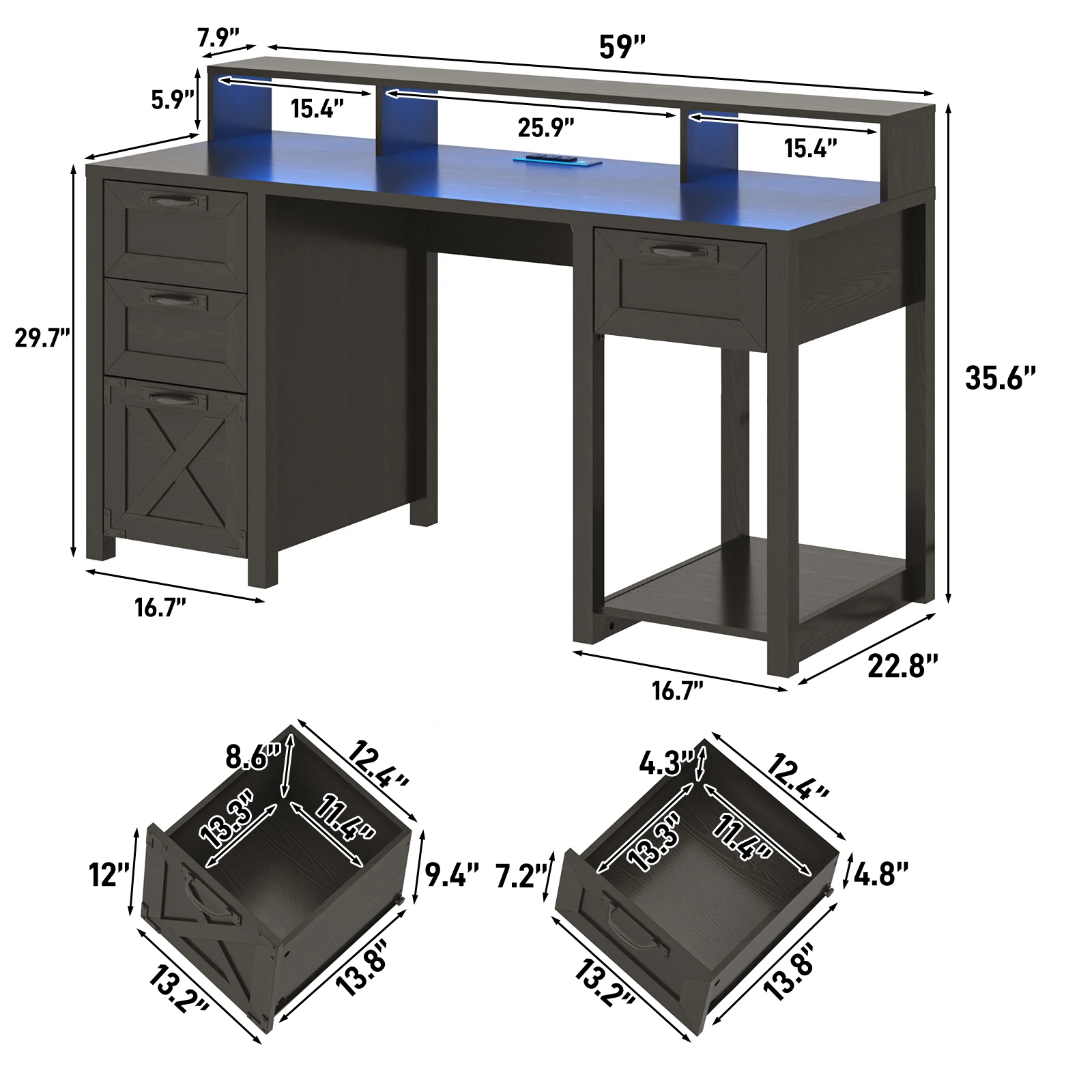 Elevate your workspace with the 59" Farmhouse Computer Desk featuring a modern design, complemented by cool LED light strips that create an inspiring atmosphere for productivity and creativity.