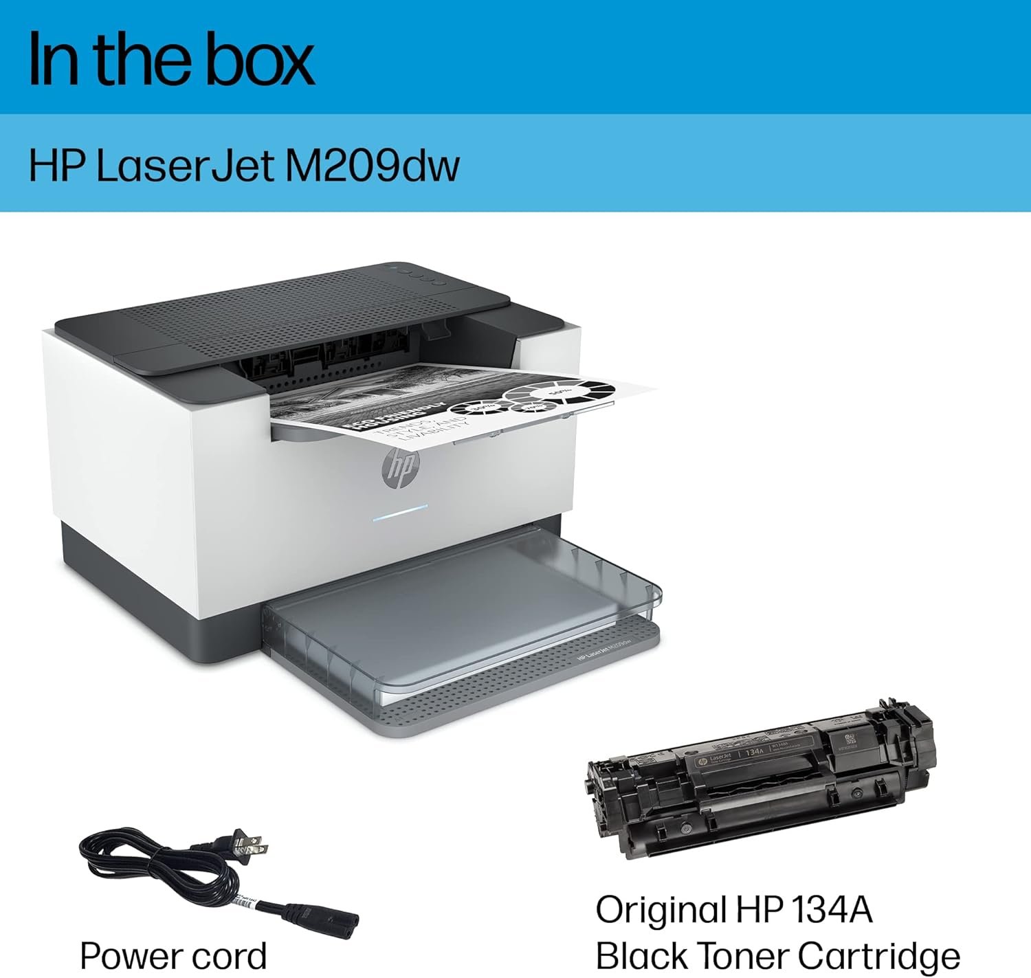 | Included Components | 6GW62F HP LaserJet Pro M209dw Printer; HP Black LaserJet Toner Cartridge(~700 pages); Dust Cover; Reference Guide, Setup Poster, Warranty Guide & Flyer in some countries; Power cord |