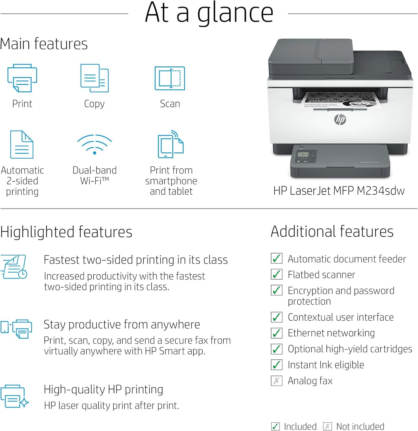 | Included Components | 6GX01F HP LaserJet MFP M234sdw Printer; HP Black LaserJet Toner Cartridge (~700 page); Reference Guide; Setup Poster; Warranty Guide & Flyer in some countries; Power cord |