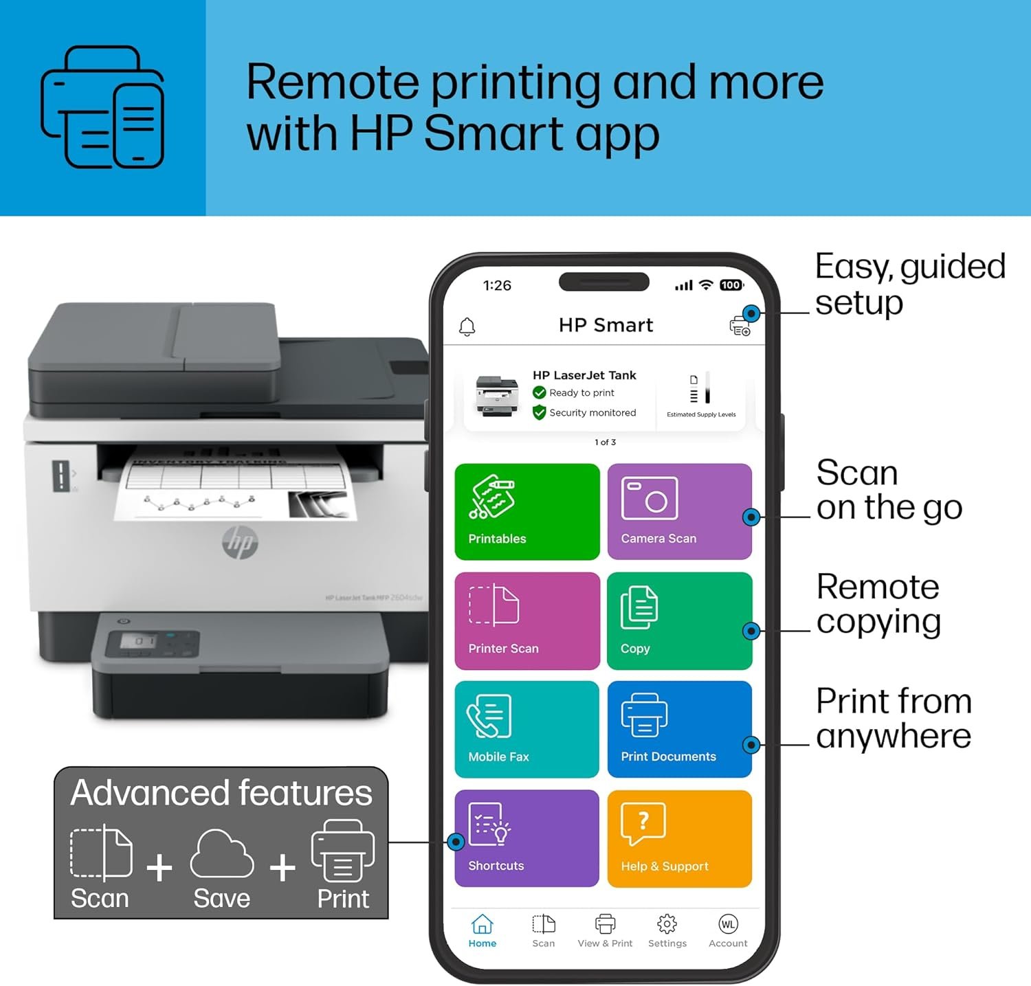 About this item BEST FOR SMALL BUSINESSES – Designed for everyday black-and-white printing jobs at the lowest cost per page POWERFUL PRODUCTIVITY – Print, scan and copy, and get more done with fast 2-sided printing and an auto document feeder PREFILLED WITH UP TO 2 YEARS OF TONER – Enough to print up to 5,000 pages right out of the box REPLENISH FAST FOR A LOT LESS – Refill toner in 15 seconds with mess-free refill using the low-cost, high-yield Original HP Toner Reload Kit PRINT PROFESSIONAL REPORTS AND FORMS – Produce sharp text and bold blacks with exceptional laser quality PRODUCTIVITY ON THE GO – Fast mobile setup and print, scan and share anytime, anywhere with HP Smart app WORK WITHOUT INTERRUPTIONS – Dual-band Wi-Fi with self-reset keeps you connected and Ethernet networking lets you easily share resources SAFEGUARD DOCUMENTS AND DATA – HP Wolf Essential Security helps maintain privacy and password protection