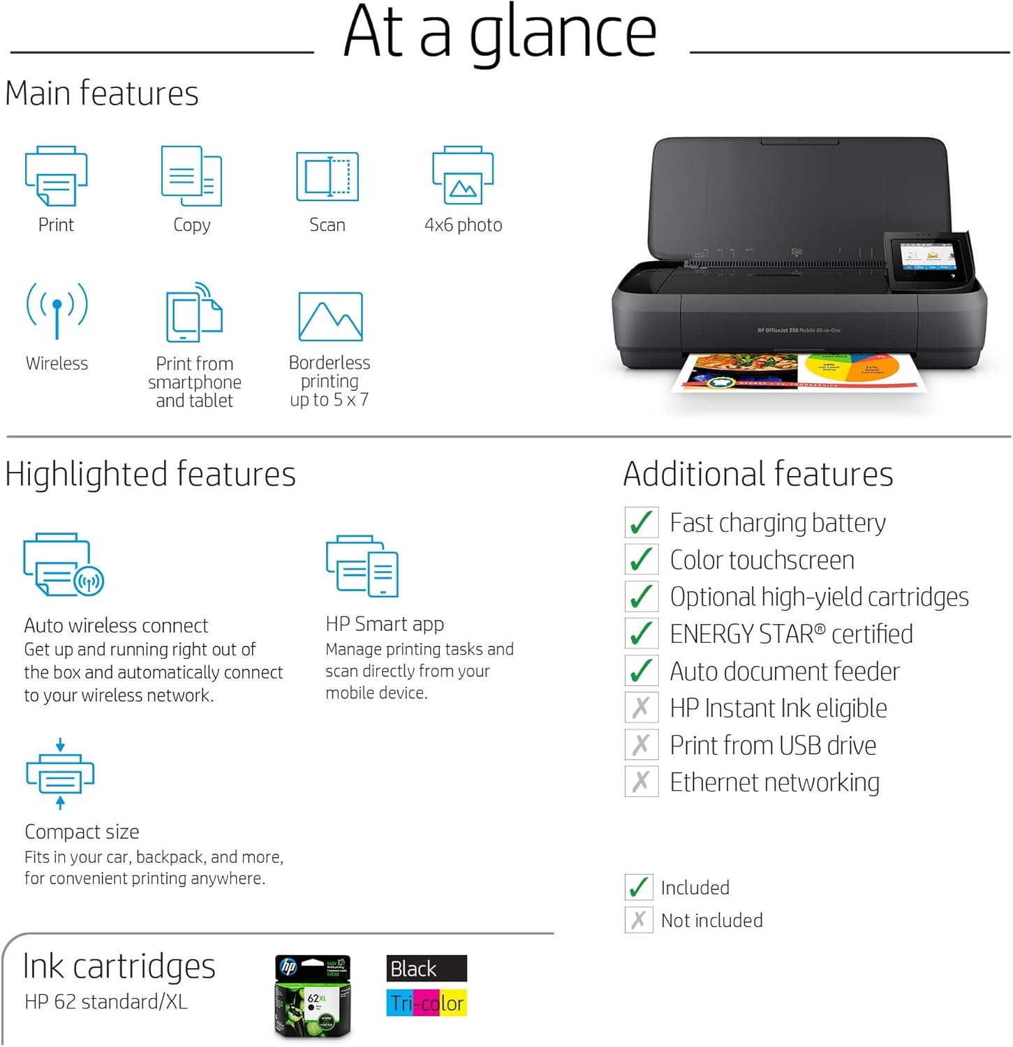 Functions, photo sizes supported, wireless, mobile printing, borderless printing