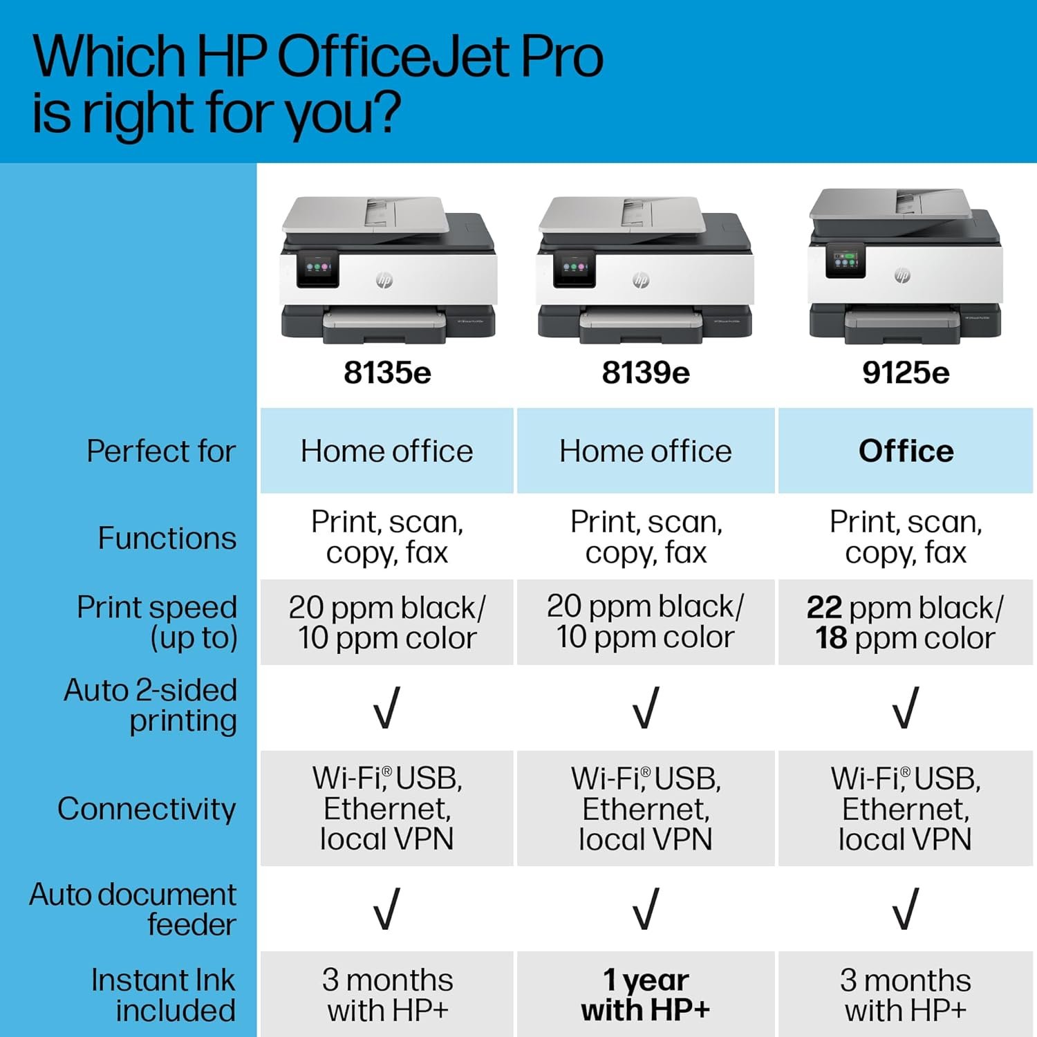 About this item FROM AMERICA’S MOST TRUSTED PRINTER BRAND – The OfficeJet Pro 8139e is perfect for home offices printing professional-quality color documents like business documents, reports, presentations and flyers. Print speeds up to 10 ppm color, 20 ppm black. UPGRADED FEATURES – Fast color printing, scan, copy, fax, auto 2-sided printing, auto document feeder, and a 225-sheet input tray. WIRELESS PRINTING – Stay connected with our most reliable dual-band Wi-Fi, which automatically detects and resolves connection issues. HP APP – Print, scan, copy, or fax right from your smartphone with the easiest-to-use print app. 1 YEAR OF INK WITH HP+ ACTIVATION – Subscribe to Instant Ink delivery service to get ink delivered directly to your door before you run out. After 1 year, monthly fee applies unless cancelled, and you save up to 50%. PROTECTS YOUR DATA – HP Wolf Essential Security bolsters security and helps keep your network protected from cyber threats. 2.7-INCH TOUCHSCREEN – Quickly navigate your printer with a large color touchscreen and a phone-like user interface.