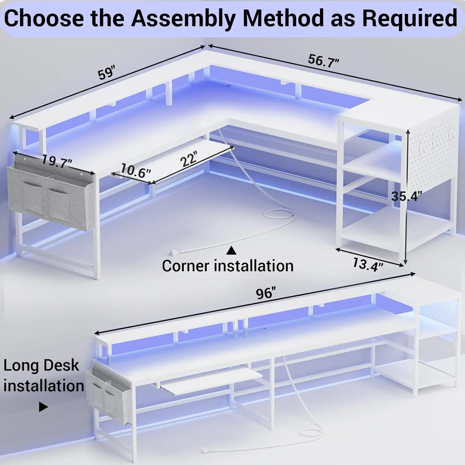 L Shaped Gaming Desk, Reversible Home Office Desk or Corner Desk, Gaming Desk with Power Outlets &LED Strip, Monitor Shelf,White