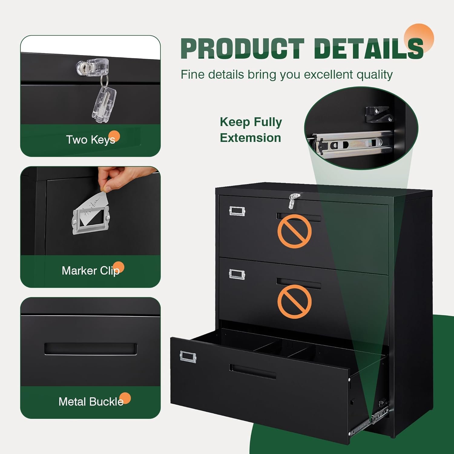 About this item 【Unique Design 】Built-in interlock system secures all drawers to make sure safe file, with folding key lock convenient to carry. With all drawers interlocking mechanism design, it will prevent tipping.Ball bearing full suspension drawers that open and close easily and quietly. 【Large Storage space 】3 Drawer wide file cabinet have deep and spacious drawers,H40*W36*D16 inch with adjustable hanging bar can hang A4 size, letter size or legal size hanging file folders to keep your document organized 【All-Steel Rustproof 】Lateral file cabinet is made of thick high-strength cold-rolled solid all-steel material.Rugged and not easily deformed, powder-coated construction making it immune to corrosion and rust.It is ideal for long-term use. Beautiful Practical】File office cabinet with modern delicate appearance can match your other furniture perfectly and adds fashion magic and charm to your office ,it’s perfect height make it can be placed under desk. 【Easy to assemble】File storage cabinet requires assembly and comes paper assembly instructionsand videos to help you complete the installation faster.