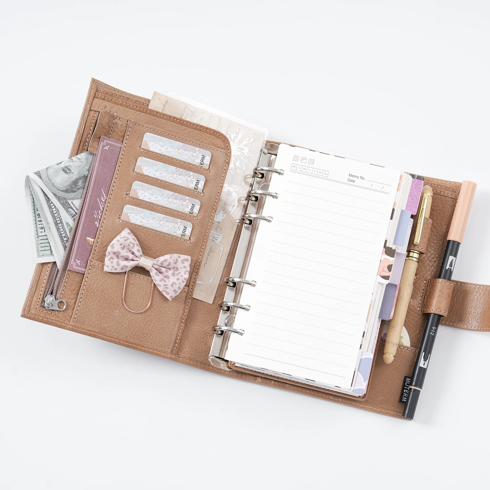 Along with your agenda and sticky notes, this organizer is equipped with a lot of card slots for storing business cards, cash, bills and other important necessities, making it both functional and aesthetically pleasing.
