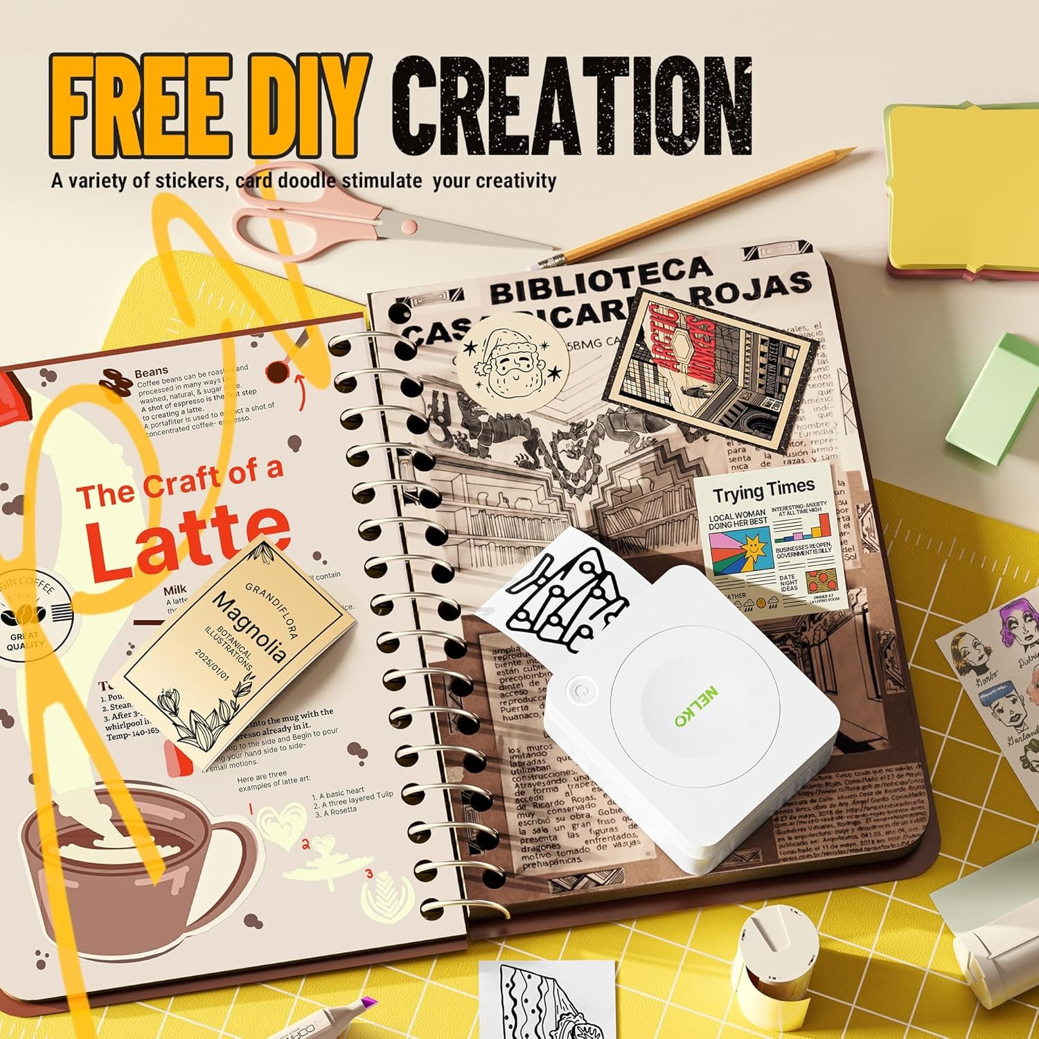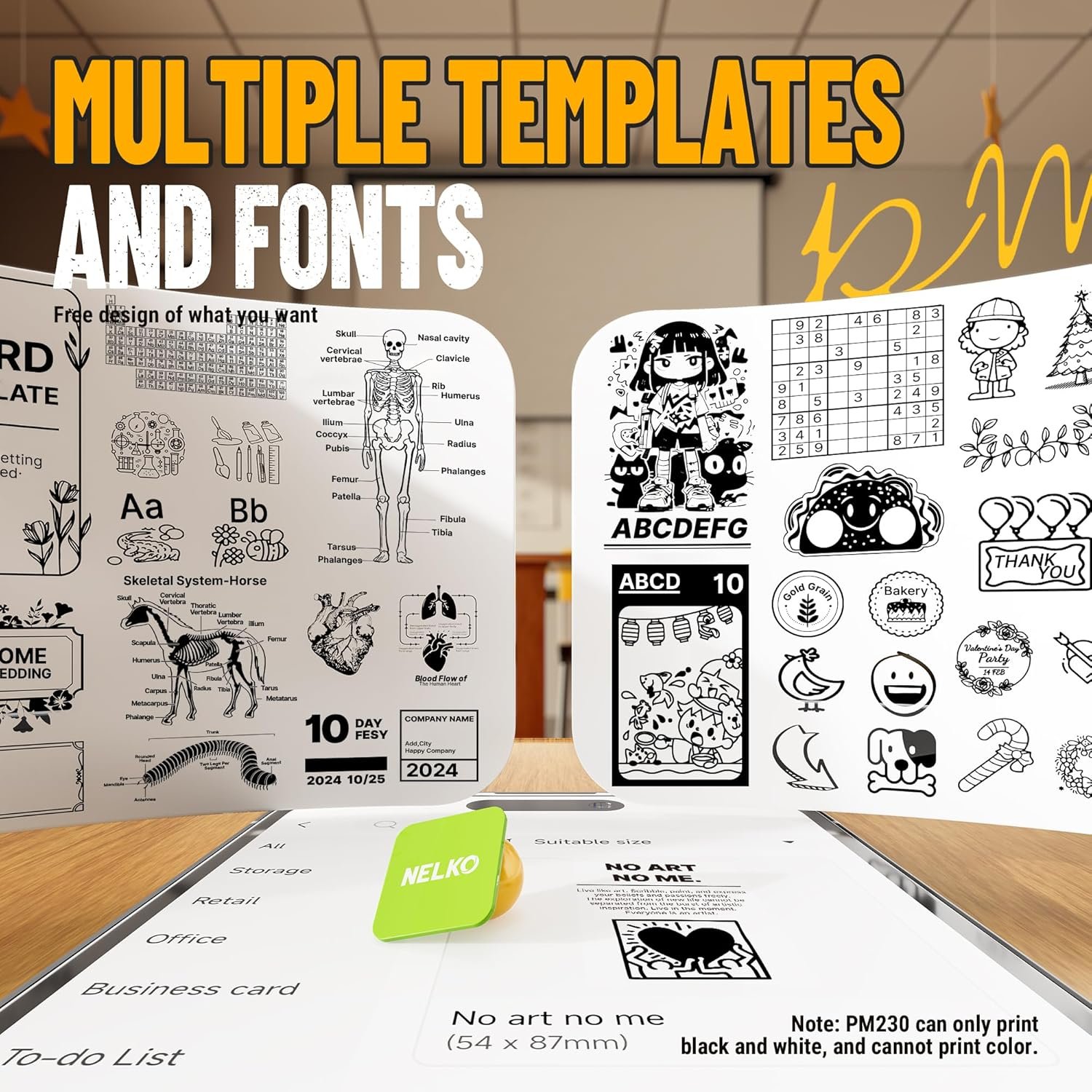 About this item Customized Sticker Printer: PM230 sticker printer comes with 3 rolls of 54mmx3.5m white sticker thermal paper, you can cut the printouts into labels of any shape and size just with a scissor so that all labeling needs. Note: if the label maker red indicator light is on even though you insert the paper, please make sure you pull the paper out of the outlet for 1-2cm. Can only print black and white. PM230 sticker printer is a great choice for Thanksgiving and Christmas gifts Bluetooth Connection: NELKO mini sticker printer compatible with IOS & Android Phone via bluetooth connection. Step 1: Download “Nelko” APP from Google Play or App Store. Step 2: Long press the printer switch and the white light flashes. Step 3: Turn on the phone bluetooth. Step 4: Open the”Nelko” App and click “Un connected”, refresh and click “PM230″ and connect. To start printing, please refer to the instructions and follow the instructions. Does not support computer printing Powerful APP: The Nelko APP of this print pods mini printer has multiple template resources. The Nelko PM230 sticker printer can immediately print photos and text through AI Printing, OCR, Scan, Print Docs and other functions. The Nelko PM230 mini printer is interesting, but it is not a camera and can only print black and white. Use the scanning function to print research graphics clearly, and improves your learning efficiency High-quality Printing: PM230 mini photo printer has a cute look and a small size, specially designed for kids. More importantly, compared with similar mini printer, it has clear printing and high-definition imaging, which protects children’s eyes while learning and playing. One-click printing, saving time and effort. When printing photos, be sure to select “Picture”. (Note: Not including charging adapter, not suitable for fast charging adapter) Multifunctional Mini Printer: The sticker printer is widely used in life and office. With PM230 mini sticker maker machine, you can print pictures, study notes, to-do lists, customize bookmarks, journals, greeting cards, company business, work plan, office assistant, memo. This sticker label maker is ideal for Halloween, Thanksgiving day, Christmas and holiday present to family and friends
