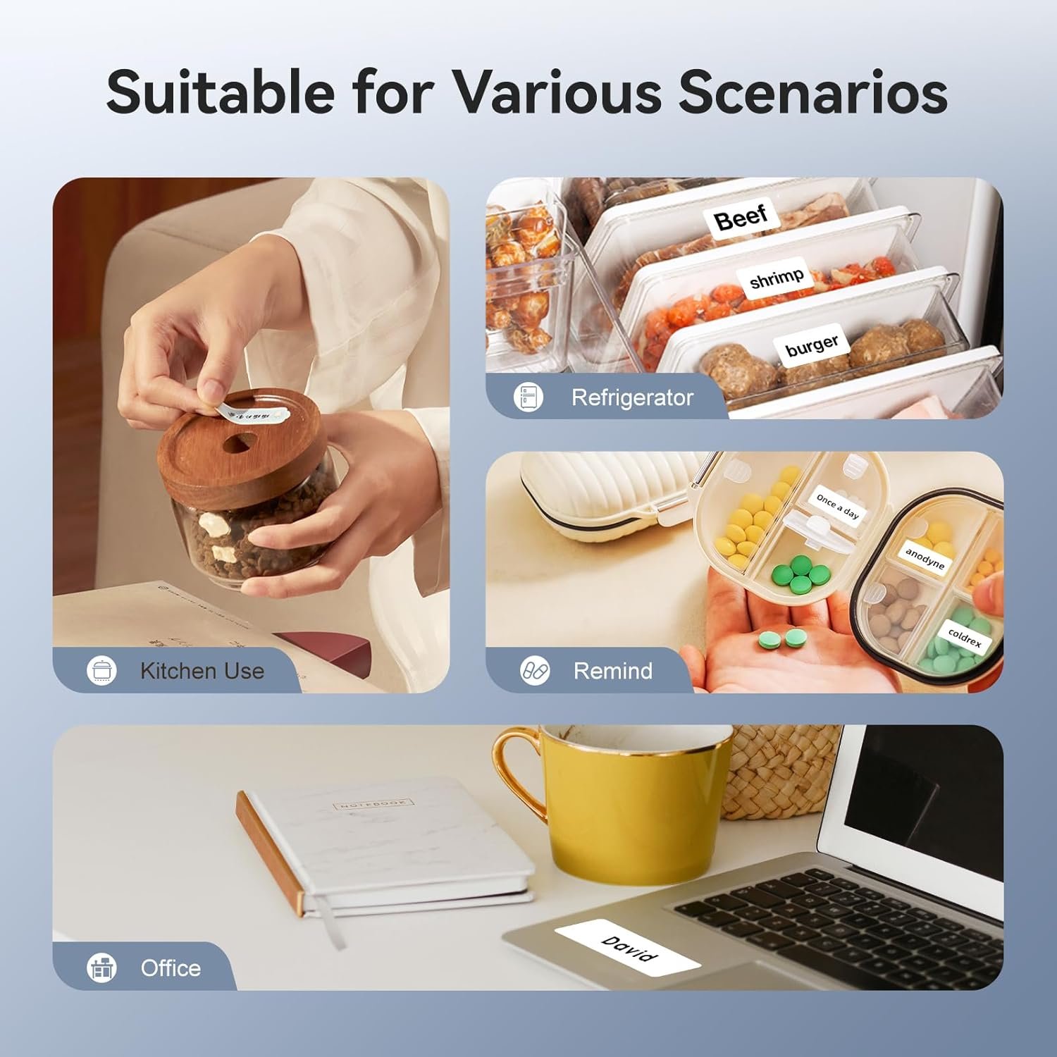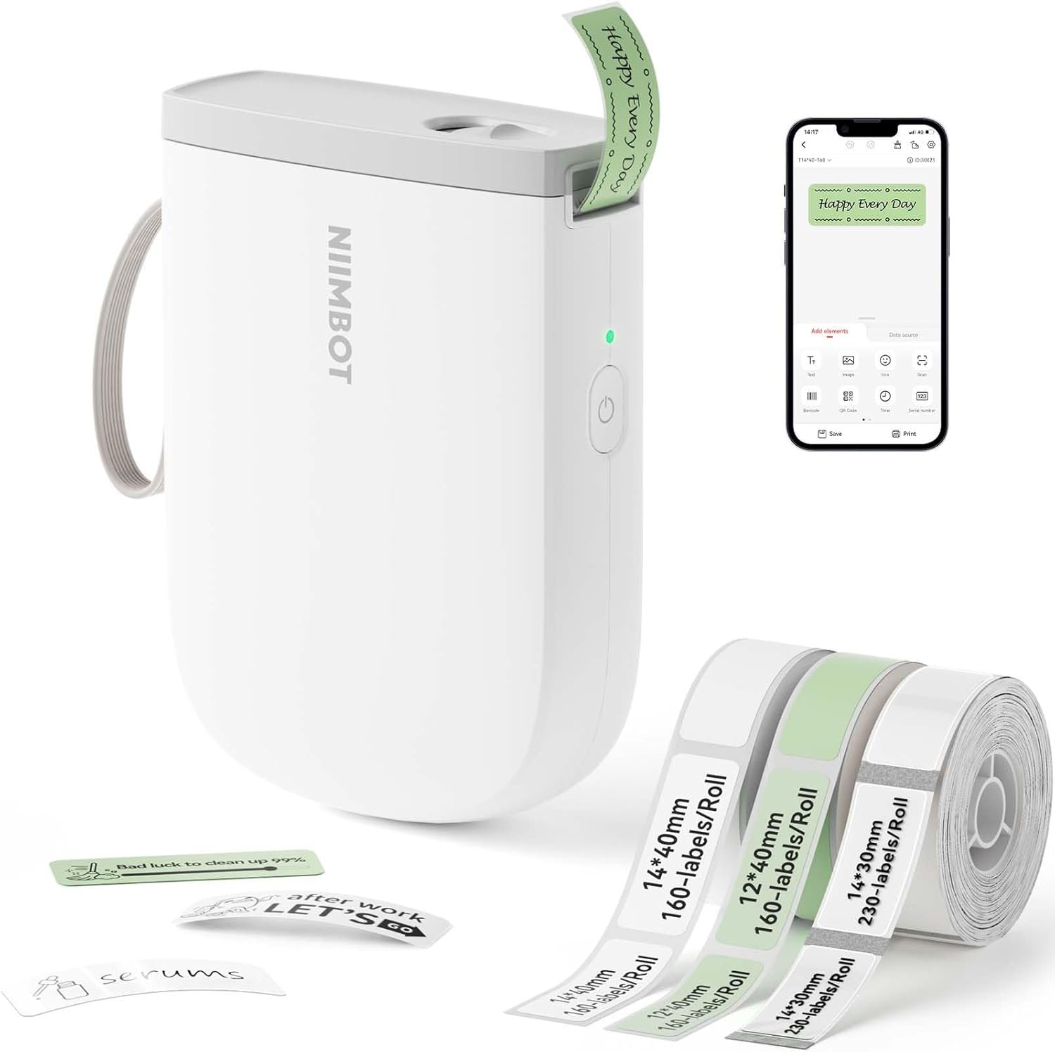 About this item 【New Version】 -With its 300 dpi upgraded resolution, D11 new version thermal label printer let you create clearer words, images.Just half size of the traditional labeling machine, get smaller and smarter and you can use it anytime and anywhere.Come with 3 roll label tapes 14*30mm clear, 14*40mm white, 12*40mm green 【Rich in Features】- NIIMBOT D11 new version portable label maker machine support automatic calibration, the first label paper will not be wasted. At the same time, this mini label printer can support 6 mobile phone printing, to meet the use of multiple people, printing speed increased to 50mm/s, improve printing efficiency. 【Note】This label maker is monochrome printout, which only prints black text.Can not print in color 【Bluetooth Connection】- This Bluetooth label printer prints labels wirelessly.Download the NIIMBOT app, NIIM app that also compatible and then connect and pair the bluetooth via the app. Only mobile Bluetooth connection, not compatible with computer or tablet 【Multiple Creative Templates】-This app of sticker printer provides a variety of free templates, containing texts, symbols, logos, barcodes, QR codes, images, time, etc.Easy to create various cute labels from your smartphone. Labels are fixed in length, not support continuous label tape. 【Wide Application】- The label maker machine with tapes is used widely in organizing home/small business supplies/swap meets/garage/yard sales, school stuffs,and office. NIIMBOT D11 label maker is also a nice choice for kids, friends, girlfriends and mothers as a present for birthday,anniversary, housewarming, wedding, back to school, Thanksgiving and Christmas