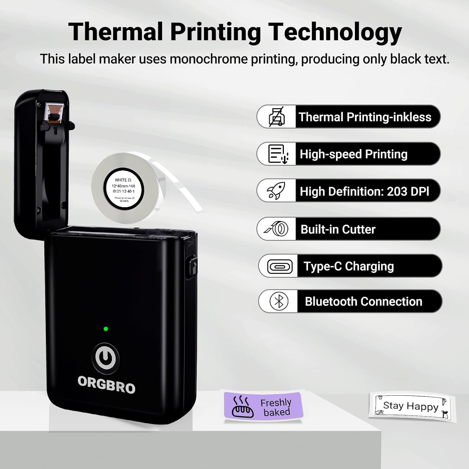 About this item Wide Range of Applications: ORGBRO X1 label maker is suitable for home organization (spices, food containers, date labeling, storage boxes, tool storage…); school and office supplies (name tags, file classification, stationery…); equipment identification or item labeling (switches, controllers, cables, cups, etc.) Easy to Use: This label maker machine with tape APP connects and sets up the device in under a minute without any payment or registration required (Notice:connect via Bluetooth should be on the App rather than Phone directly); Creates labels quickly and easily; Half the weight and size of traditional label maker, ORGBRO label printer are portable and can be operated with one hand Feature-Rich and Template-Diverse: XeasyLabel APP offers over 15 languages, 95 fonts, and 550 materials, all free to use, for easy label customization; ORGBRO label maker can print various text, numbers, graphics, symbols, logos, barcodes, QR codes, etc Save Time and Money: X1 thermal label maker uses thermal technology to deliver high-quality prints without the need for ink or toner; The label maker machine with tape built-in 2000mAh rechargeable battery provides longer operating times than other brands, saving you time and money Label Durability: ORGBRO labels waterproof, oil-resistant, and abrasion-resistant. No residue remains after removal; Supports continuous label paper (14 mm width) and fixed-length labels (12 x 40 mm); We recommend using ORGBRO thermal label paper for optimal print quality; Please do not tear or destruct the sticker on the back of the label strip , otherwise it will affect the printing effect.
