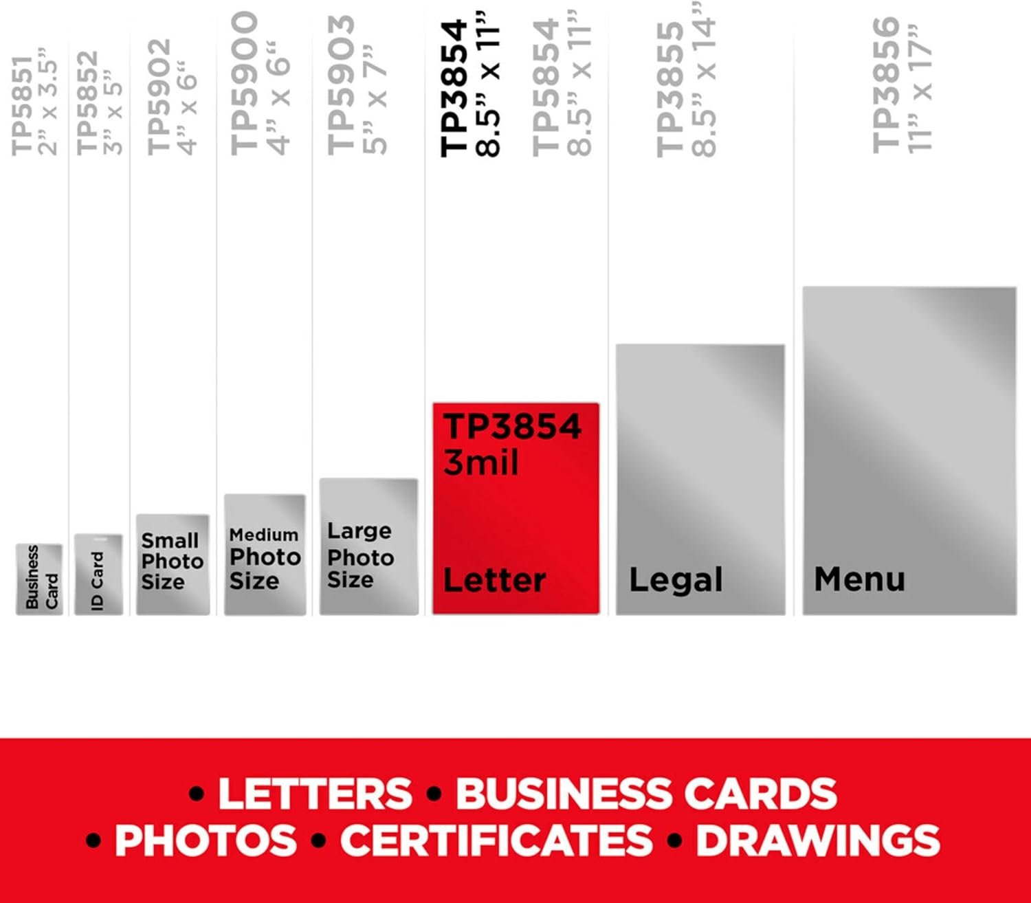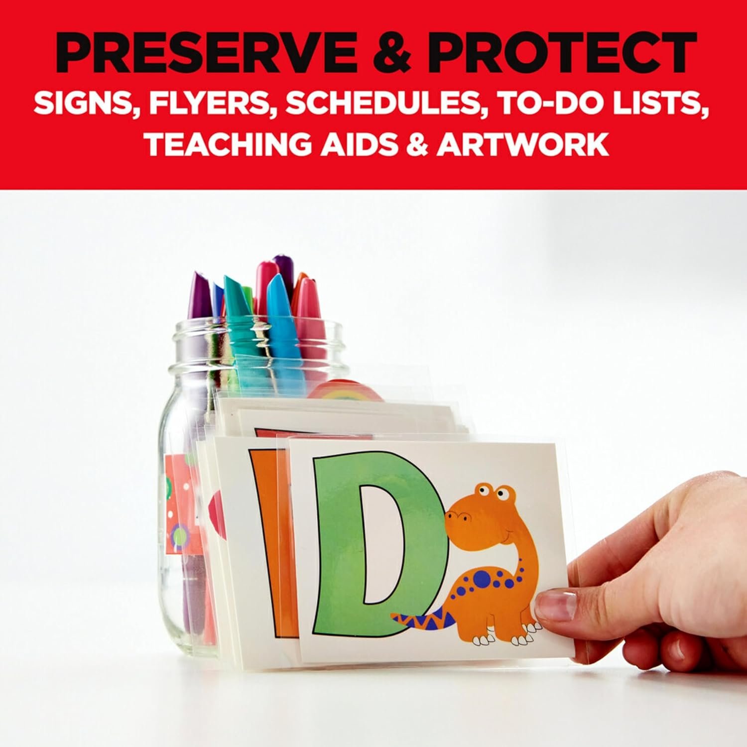 About this item THERMAL LAMINATING POUCHES: One 100-count package of Scotch Thermal Laminating Pouches, ultra-clear pouches that protect and add professionalism to essays, diplomas and other school assignments FINISH: These laminate pouches achieve a clear, photo-safe finish IDEAL FOR: Ideal for creating marker-proof, tear-proof and spill-proof paper items, making them great office supplies and school supplies to keep in your dorm room or classroom HOW TO USE: Laminate school event flyers, yearly schedules and due dates, graduation diplomas, to-do lists and plenty more CLEAN POUCHES: Most household cleaners are safe to use on these laminator pouches, so you can easily disinfect them FITS LETTER-SIZE POUCHES: One package contains letter-size pouches that fit items up to 8.9 in. x 11.4 in. USE WITH: It is recommended to use these self laminating pouches with Scotch Thermal Laminators