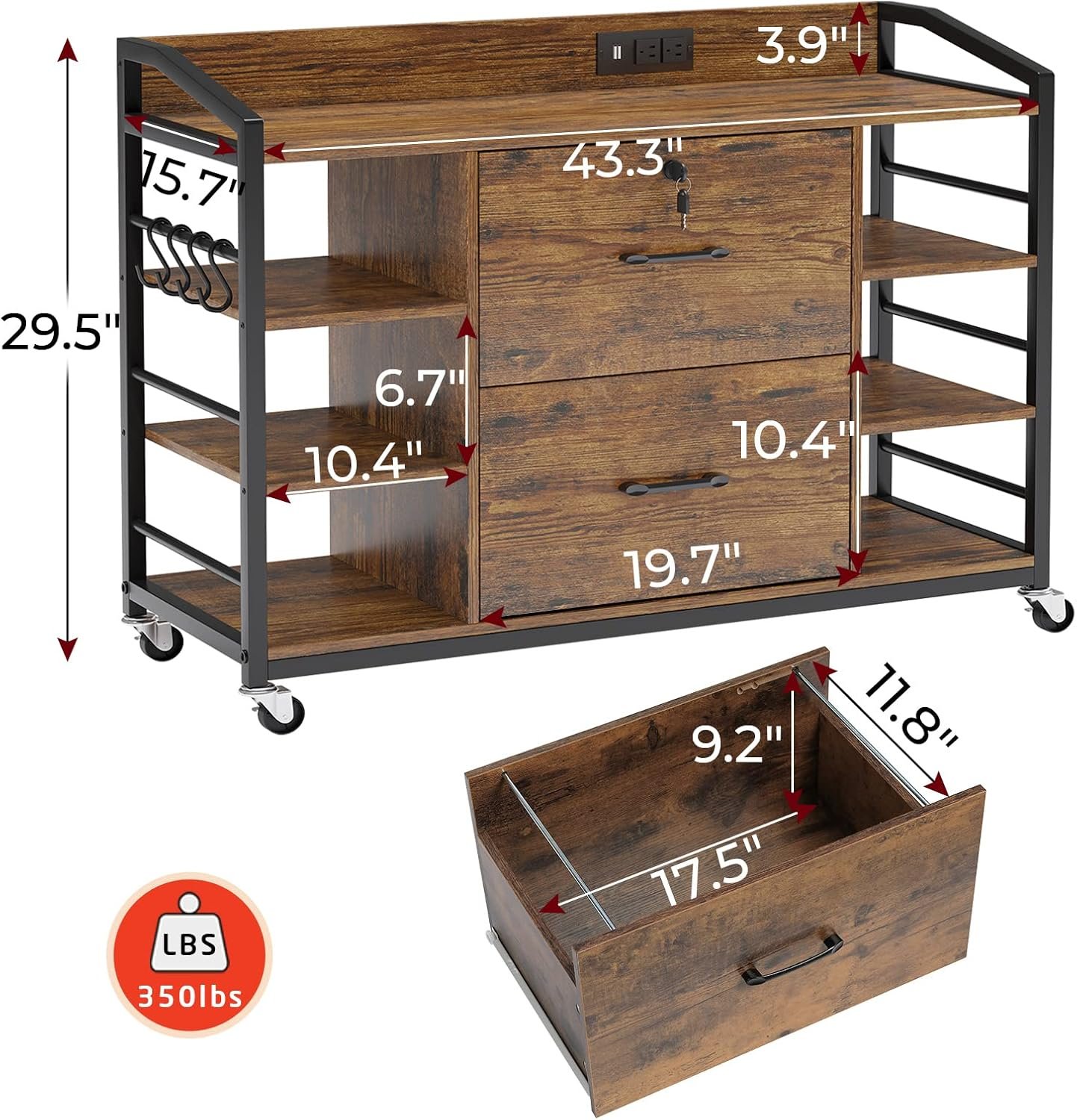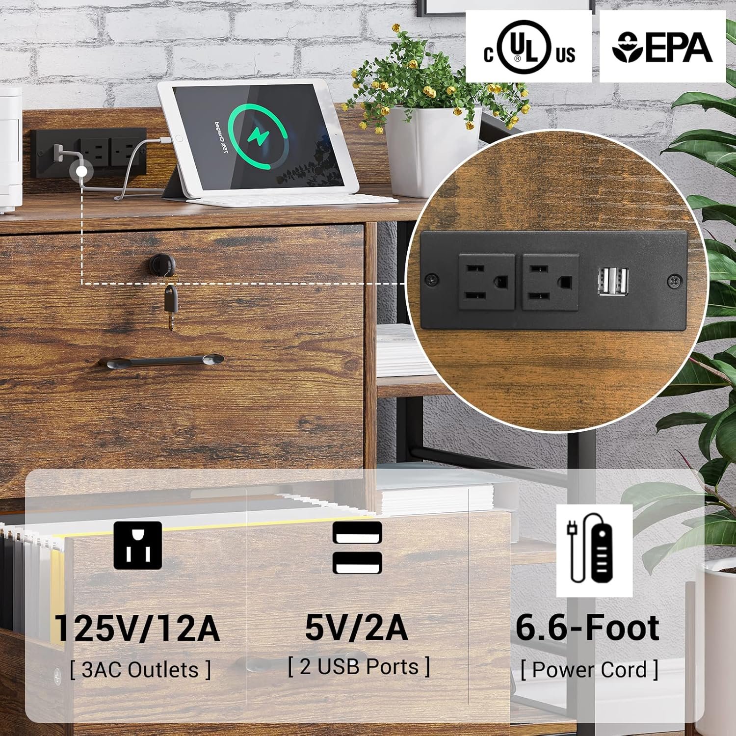 SEDETA 44″ File Cabinet, Filing Cabinet fits Legal/Letter Size, 2 Drawer File Cabinets for Home Office with Lock, Power Strip, 6 Storage Shelves, Rustic Brown