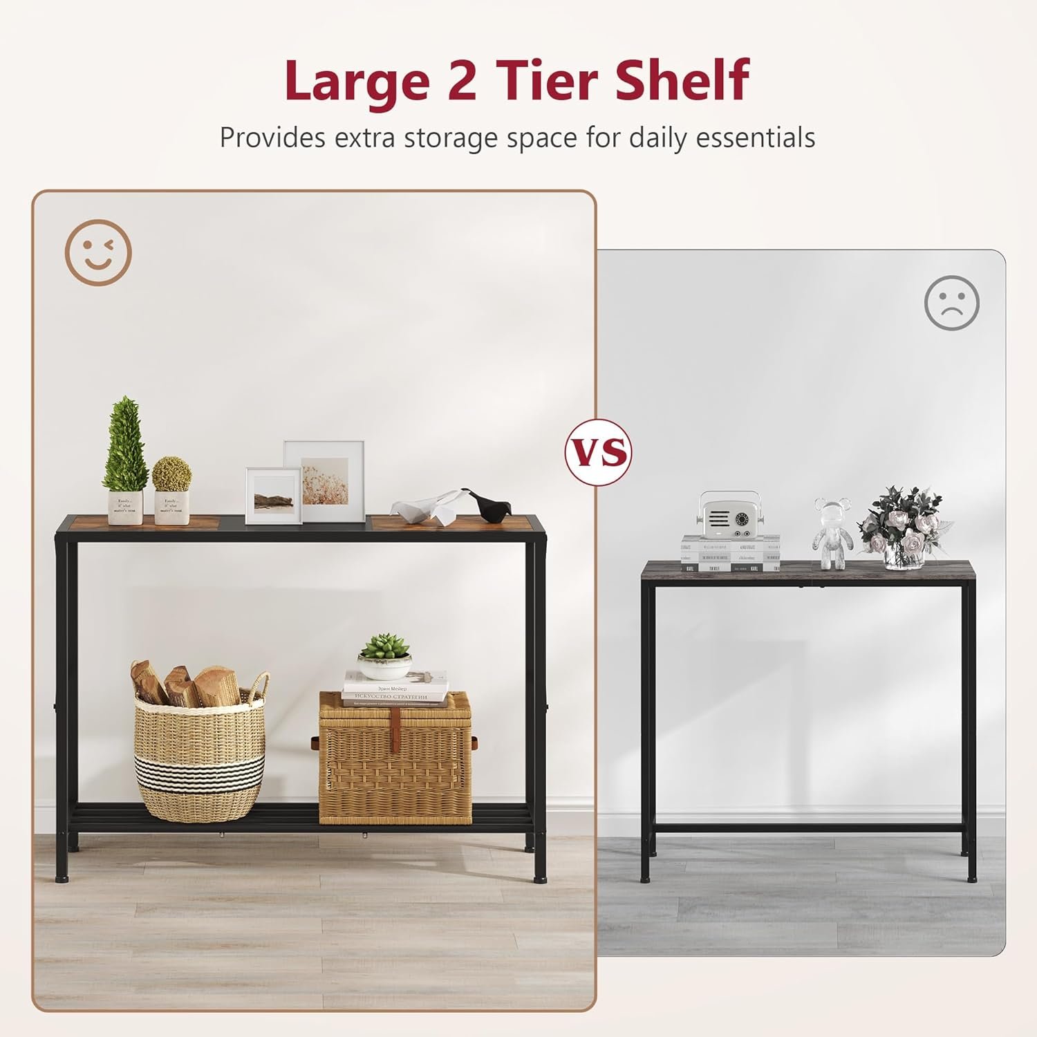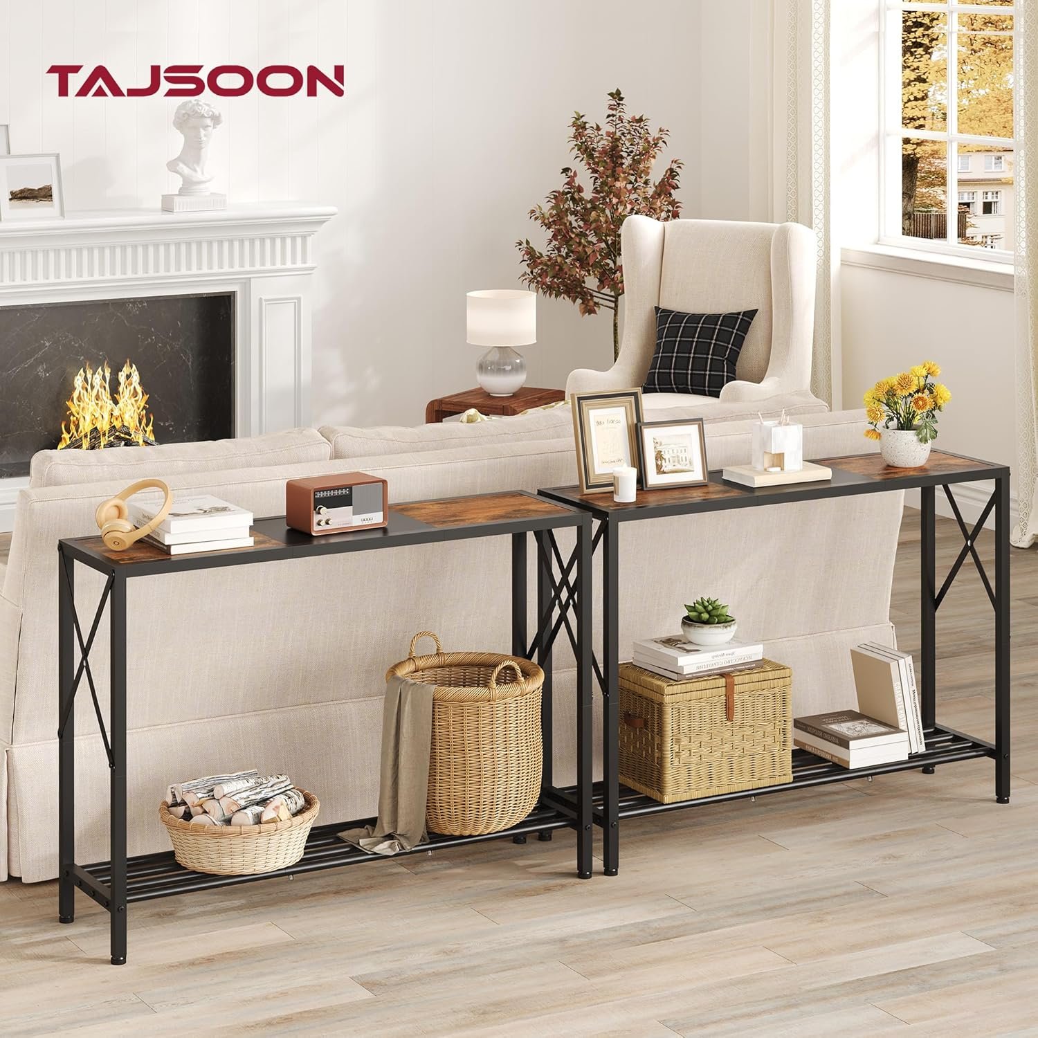 About this item 【Narrow Console Table 】 Our sofa table creats more storage space for you. Perfect size at 41.8”L x 11.5”W x 30.2”H, you can put it in any narrow place. 【Sturdy & Durable】Tajsoon hallway foyer table is made of spliced-colored wood and heavy duty metal, sturdy enough to offer a long service life. The additional X-shaped frame strengthens the stability of the entrance table greatly. 【Easy to Assemble】Clear and detailed instructions, and numbered parts are included in the package to ensure you assemble this hallway table quickly and easily. 【Safety First】The behind couch table features 4 adjustable footpads to prevent shaking on uneven surface and protect your floor from scratches, which make the hallway table stable and safe to use. 【Multifuction】The entryway table with storage can be placed in the entryway, hallway, living room, couch, kitchen etc. Furthermore, the TV console table can be used as sofa table to place green plants, scented candles, meeting your different needs. 【Reliable】The top panel is made of FSC-Certified wood