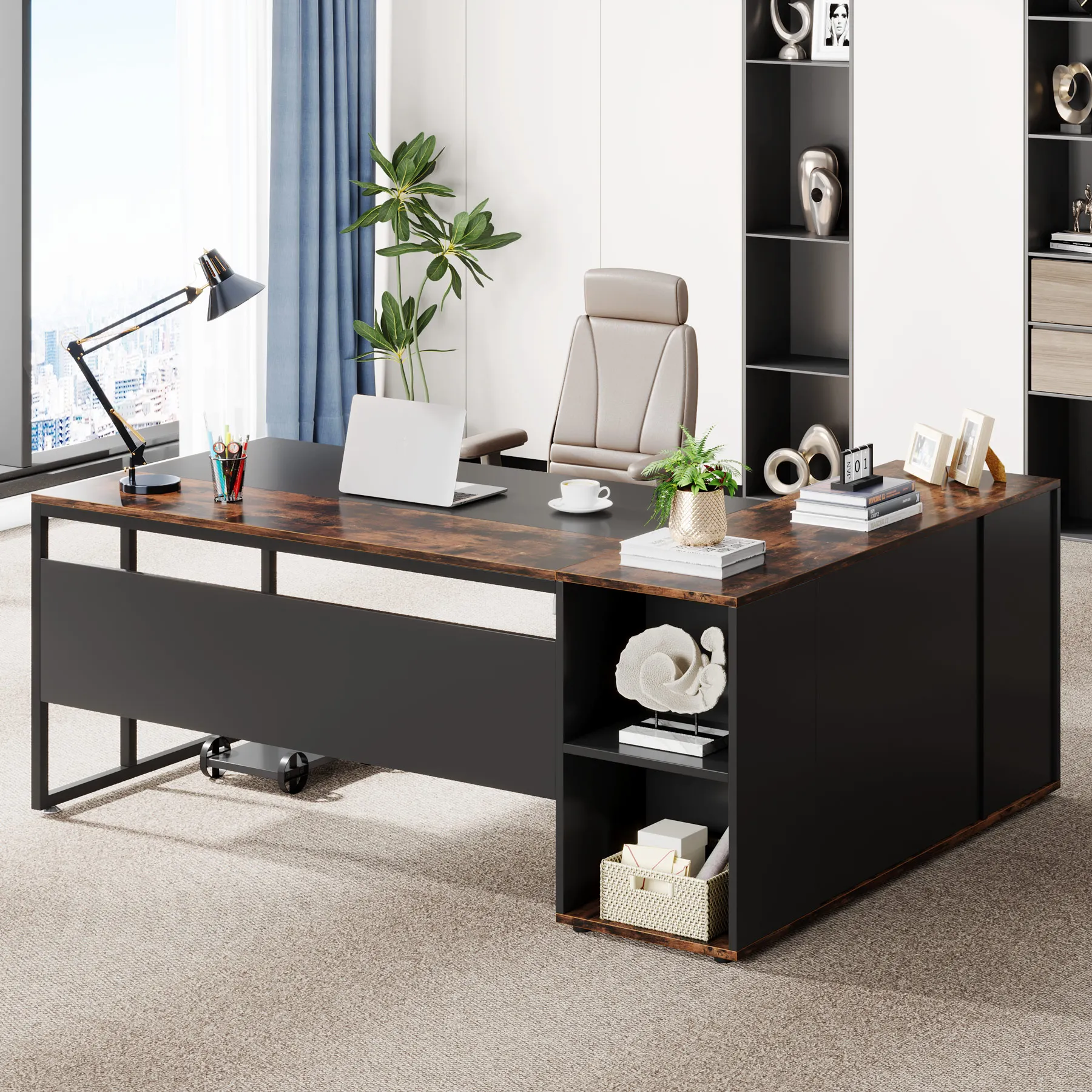 AMPLE STORAGE SPACE: Coming with a storage cabinet, printer cabinet, CPU stand and storage shelves, this executive desk could hold printers, scanners, fax machines and any other office machines, keeps them within easy reach of your desk to maximize your work space. With powerful storage space, this L shaped computer desk can meet different storage needs.