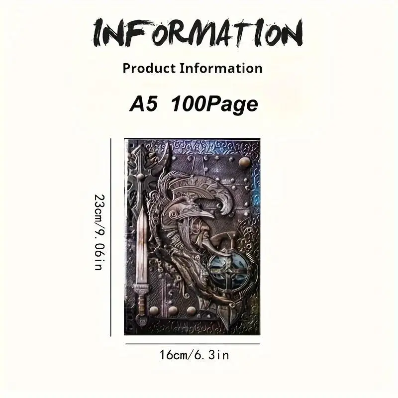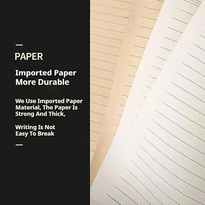 The notebook features a dignified soldier relief design on a durable PU leather laminated cover, resistant to water and wear. Smooth, rounded corners ensure comfort. It opens flat at 180°, enhancing usability. With 100 sheets/200 pages of thick, bleed-resistant paper, it offers a superior journaling experience.